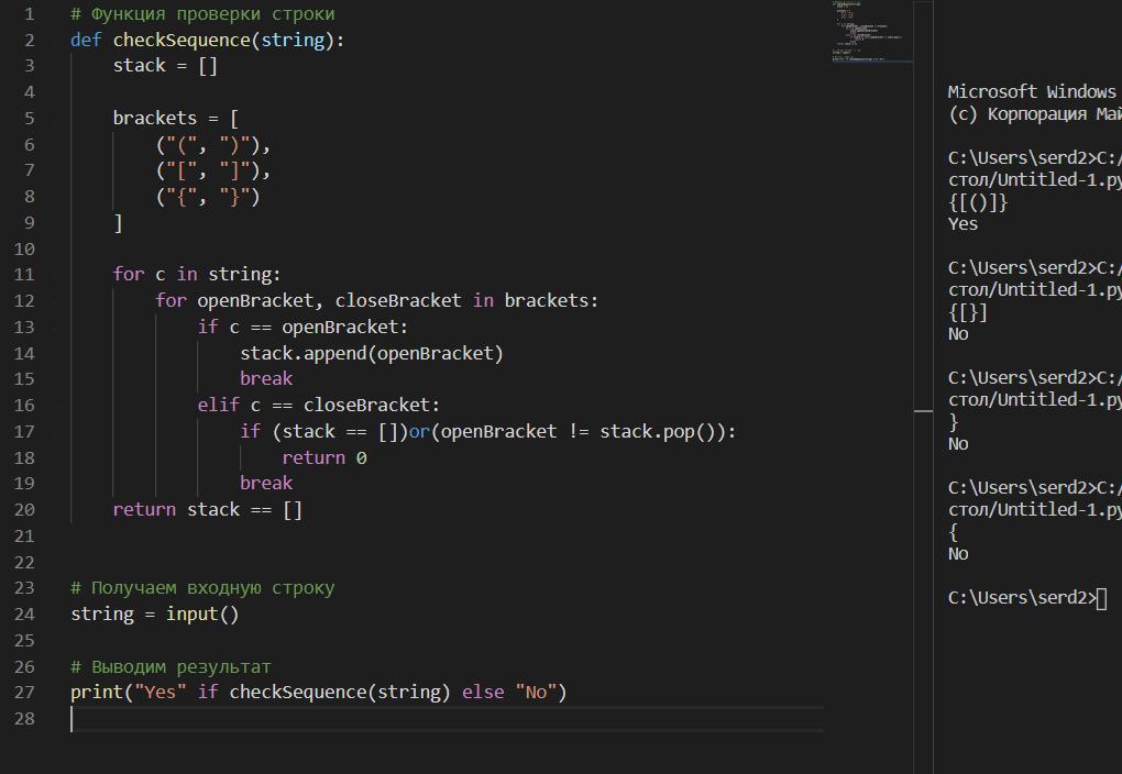 Как решить проект " На своих местах " в Python? Дана строка, содержащая буквы и скобки '(', ')', '[', ']', '{', '}'. Если скобки расставлены правильно (то есть каждой открывающей скобке соответствует закрывающая того же вида, порядок не важен!), то вывести 'yes', иначе выведите 'no'. Помогите пожалуйста!