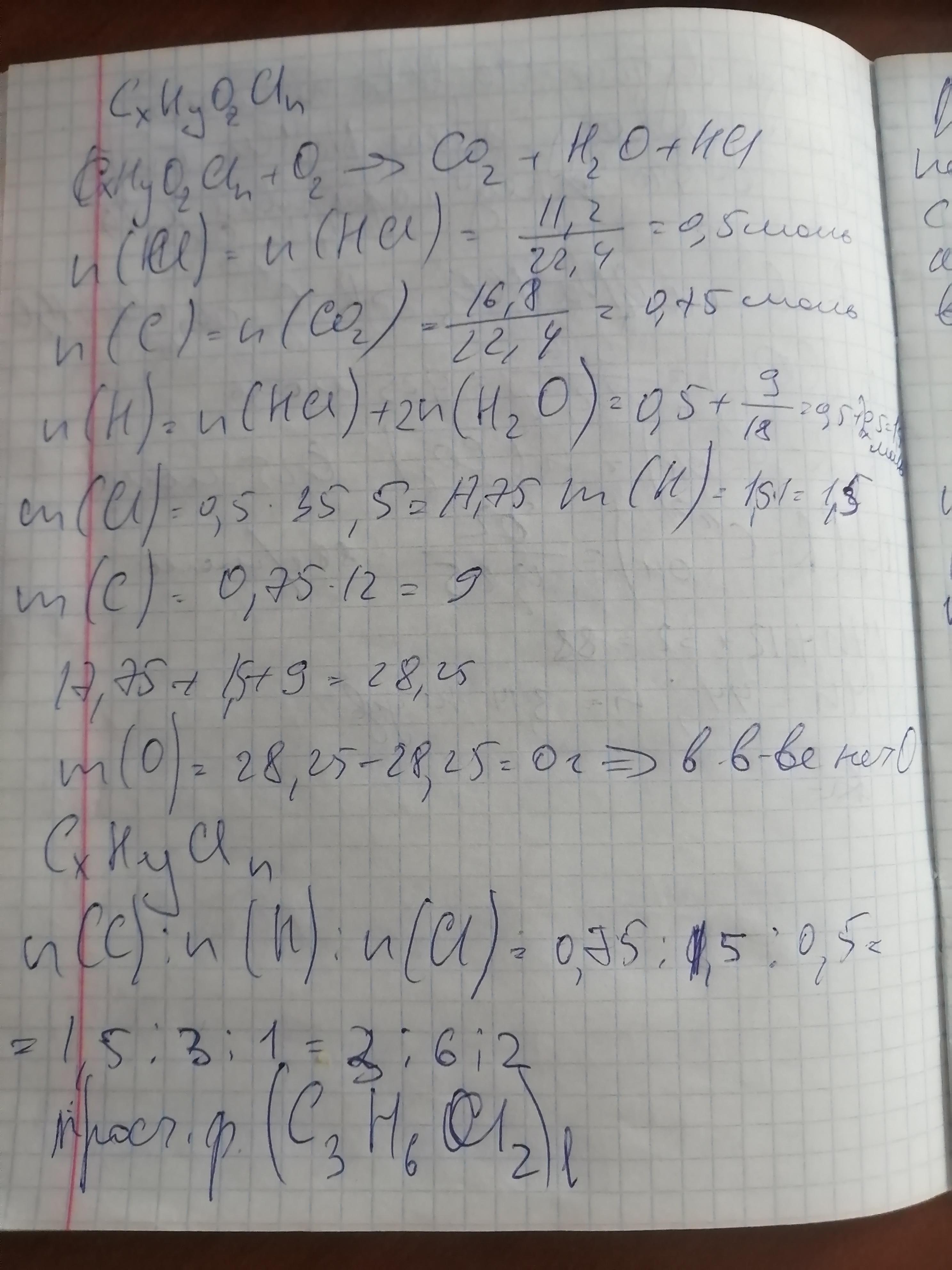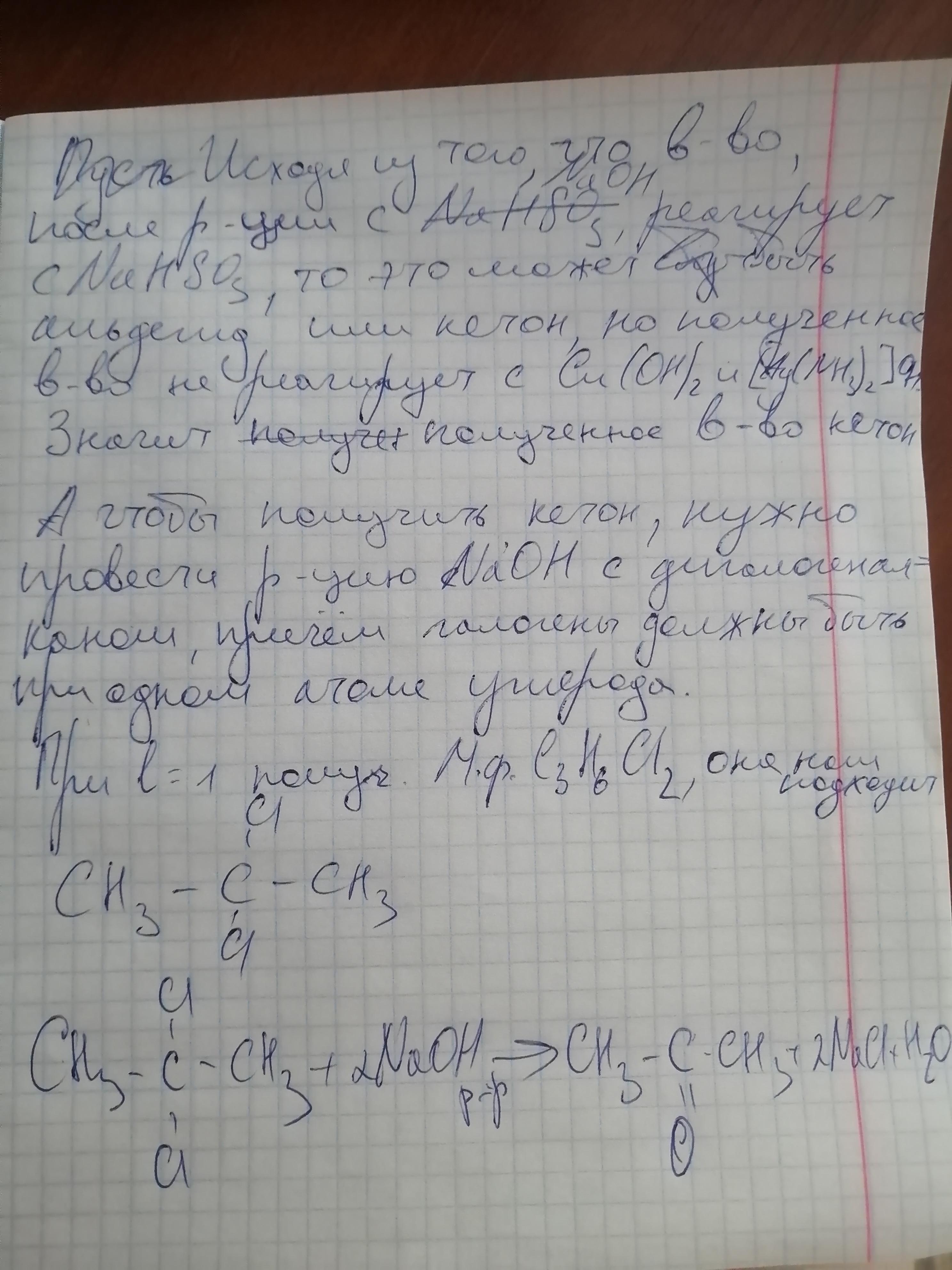 при сгорании 28,25 г органического вещества выделилось 16,8 л газа, 9 г воды, 11,2 л хлороводорода. известно, что при взаимодействии этого вещества с водным раствором щёлочи образуется кислородосодержащее вещество, которое не взаимодействует с аммиачным раствором оксида серебра и с гидроксидом меди(2), но реагирует с гидросульфитом натрия. Выведите формулу этого вещества и напишите уравнение реакции этого вещества с водным раствором щёлочи.