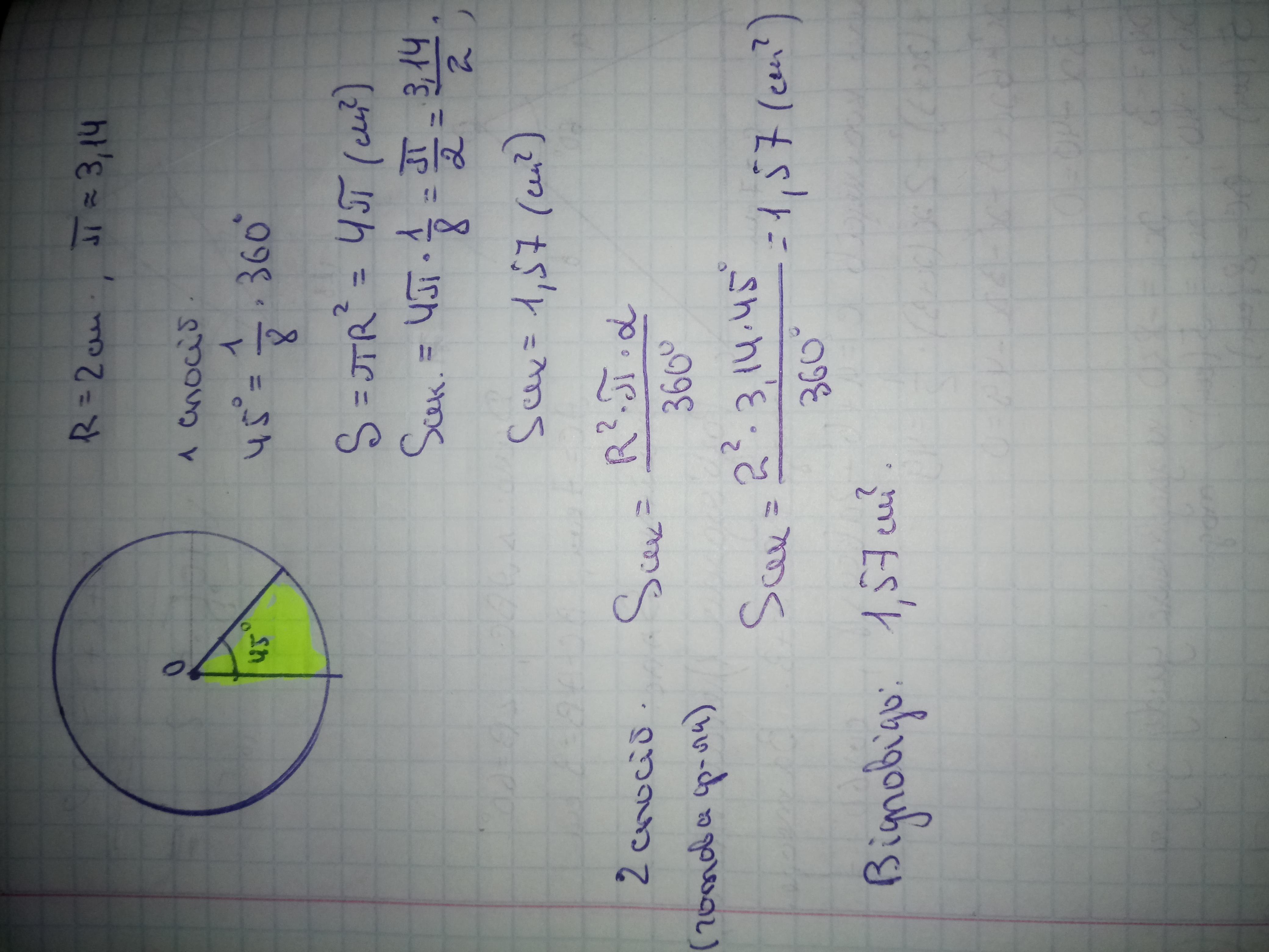 Радіус круга дорівнює 2 см. Знайдіть площу сектора, якщо він вимірюється кутом у 45° (число π округліть до сотих).