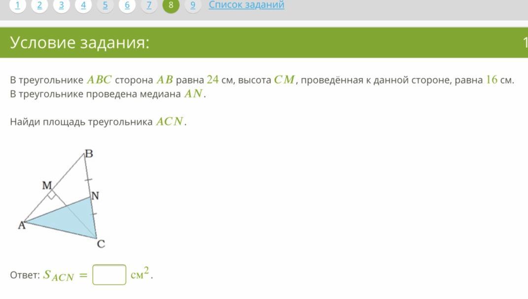 В треугольнике сторона равна 24 см, высота , проведённая к данной стороне, равна 16 см. В треугольнике проведена медиана . Найди площадь треугольника . Ответ: = ?
