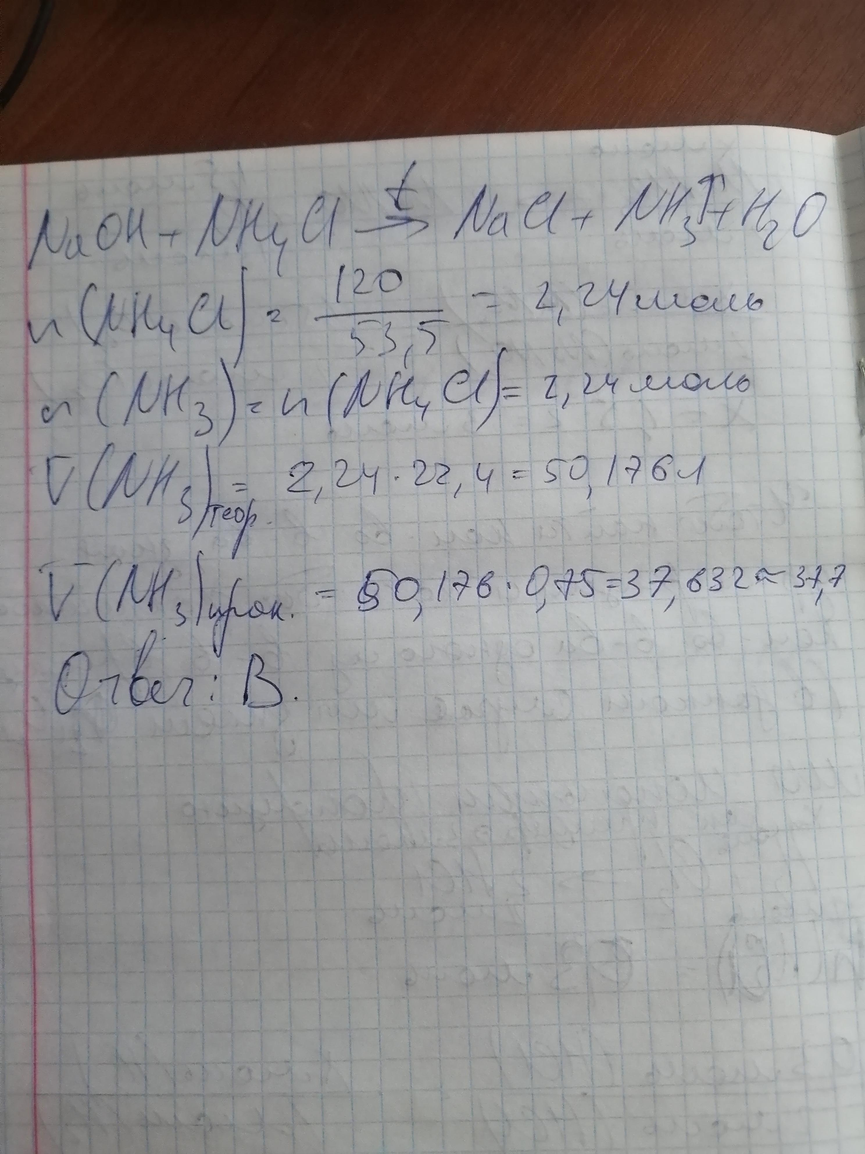 Определить объем (н.у.) аммиака, который можно получить действием гидроксида натрия на хлорид аммония массой 120 г, если производственные потери аммиака составляют 25%. А 44,8 л Б 25,4 л В 37,7 л Г 41,4 л