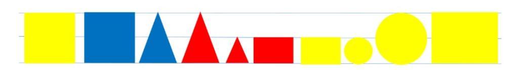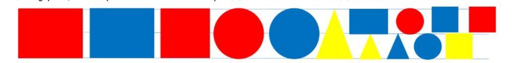 Также очевидно,что сначала идет 1 фигура 1-го цвета, потом 2 фигуры 2-го цвета, 3 фигуры 3-го цвета, 4 фигуры 1-го цвета и т.д. + чередуется величина фигур(4 большие,4 малые)