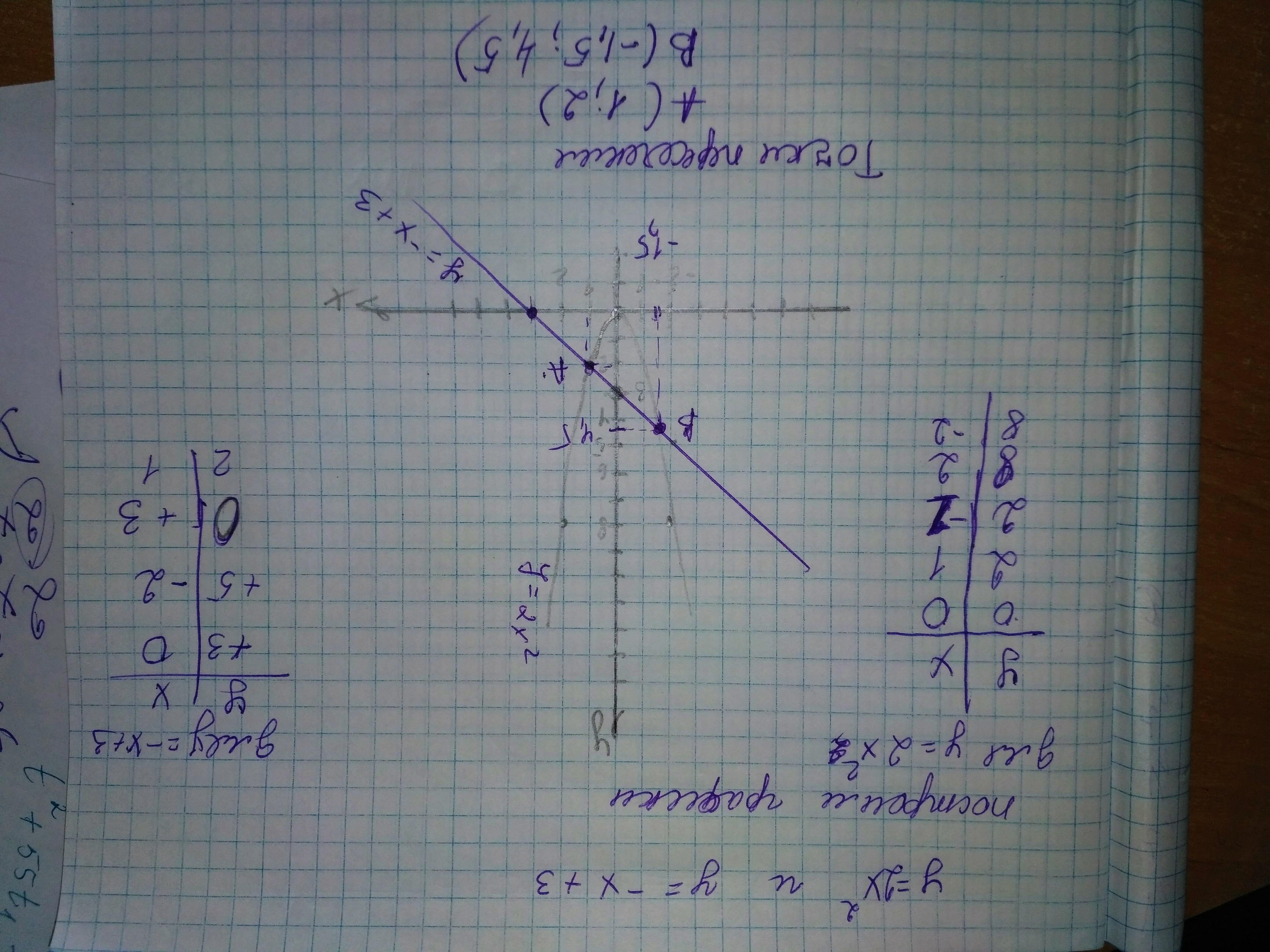 Найти точки пересечения графиков функций у=2х^2 и у=-х+3. Построить их графики в одной системе координат для проверки.
