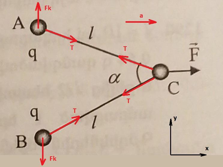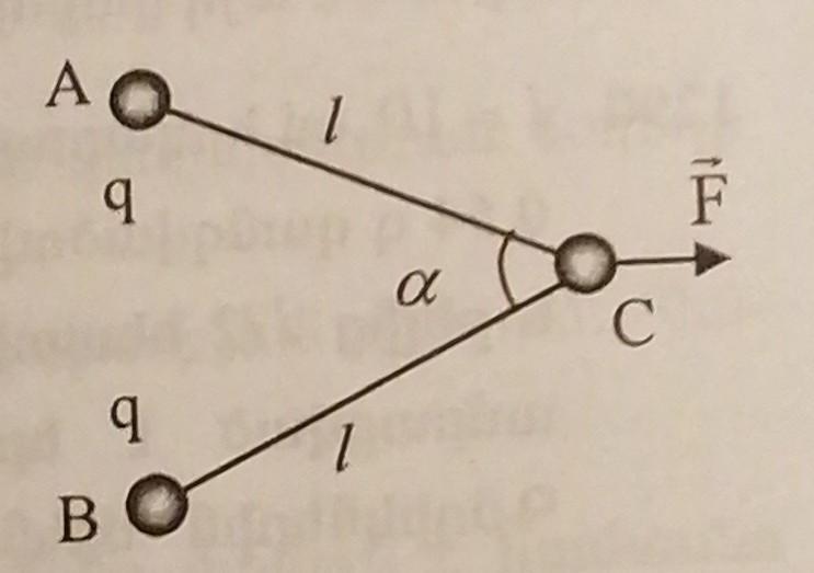 Система из трех шаров, два из которых соединены с третьим посредством изолирующих нитей (l=0.03метр), перемещается под действием силы, приложенной к С-шару. Масса каждого из трех шаров - 10 г. Шары A և B заряжаны одинаково (q=10^(-7)Кулон), а шар C не заряжан. Угол резьбы 60 °. Игнорируйте силу тяжести.