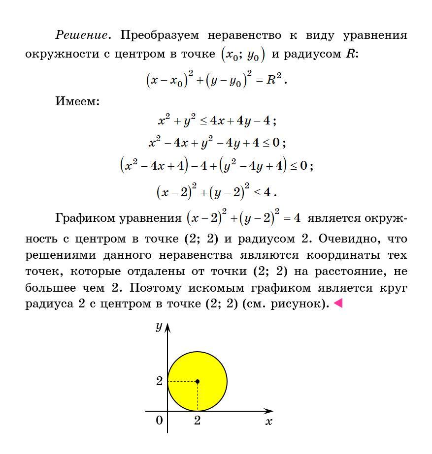нужно выделить полные квадраты... х^2-4х нужно прибавить 4 и отнять 4: (х^2-4х+4)-4 = (х-2)^2 - 4... с переменной (у) аналогично)) все числа перенесем в правую часть неравенства... получим (х-2)^2+(у-2)^2 <= +4+4-4... это уравнение части плоскости, ограниченной окружностью с радиусом r=2