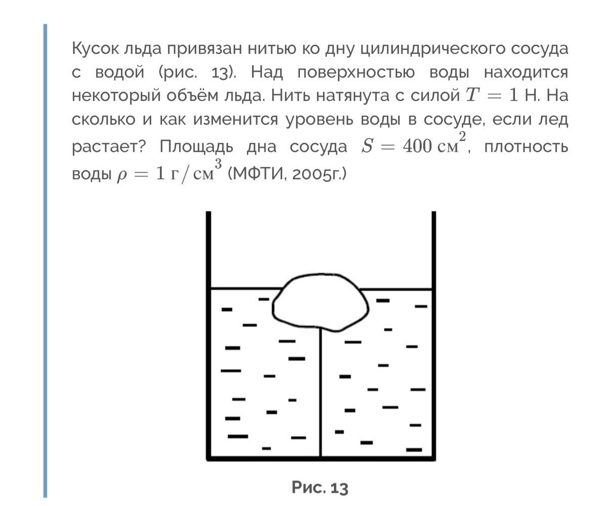 Кусок льда привязан нитью ко дну цилиндрического сосуда с водой (рис. 13). Над поверхностью воды находится некоторый объём льда. Нить натянута с силой `T=1` H. На сколько и как изменится уровень воды в сосуде, если лед растает? Площадь дна сосуда `S=400 "см"^2`, плотность воды `rho=1 "г"//"см"^3` (МФТИ, 2005г.)