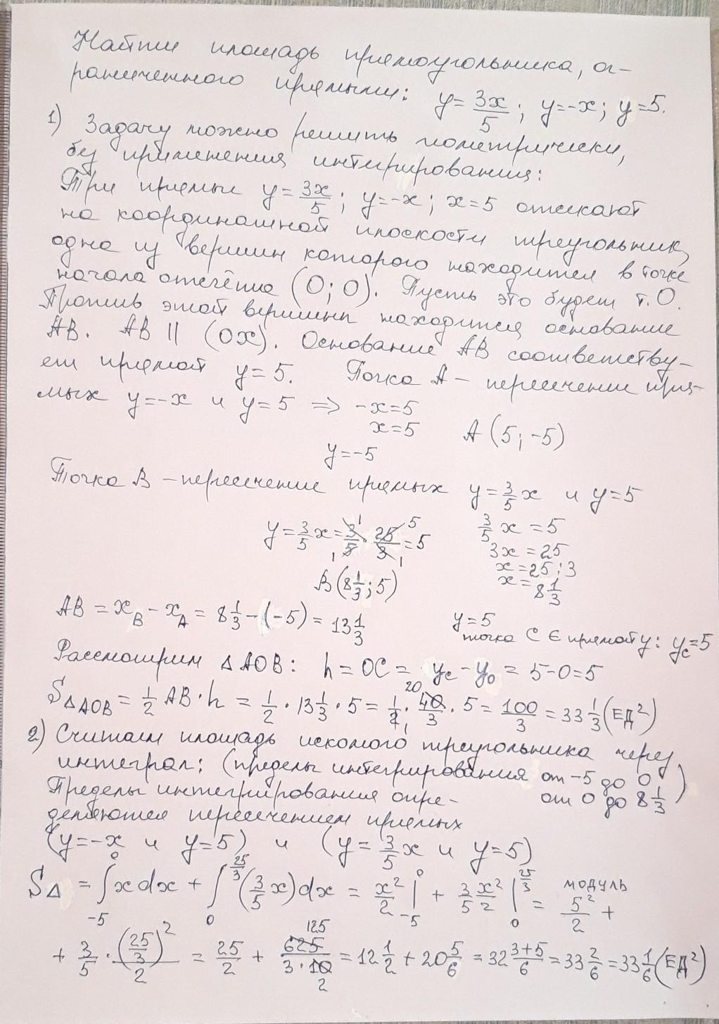 Найдите площадь треугольника, ограниченного прямыми y=3x/5, y = − x , x=5 .