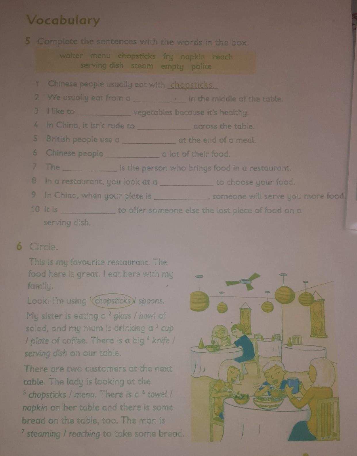 2. A bowl of salad, 3. A cup of coffee, 4. This is a big knife, 5. The lady is looking at the menu. 6. There is a napkin on her table, 7. The man is reaching
