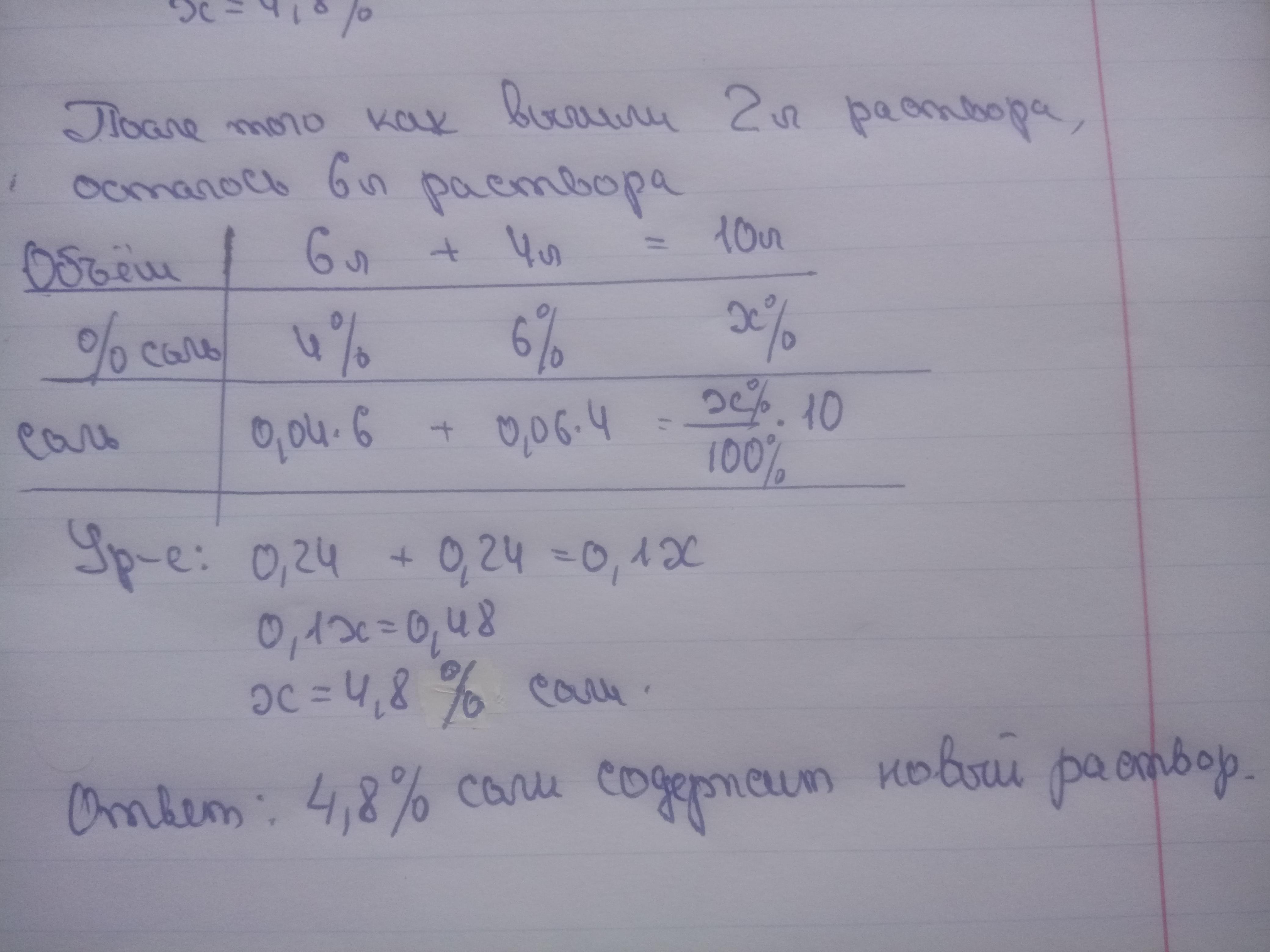 В сосуде было 8 литров 4%-го раствора соли. Из сосуда вылили 2 литра раствора и добавили 4 литра 6%-го раствора соли. Сколько процентов соли содержит вновь полученный в сосуде раствор?