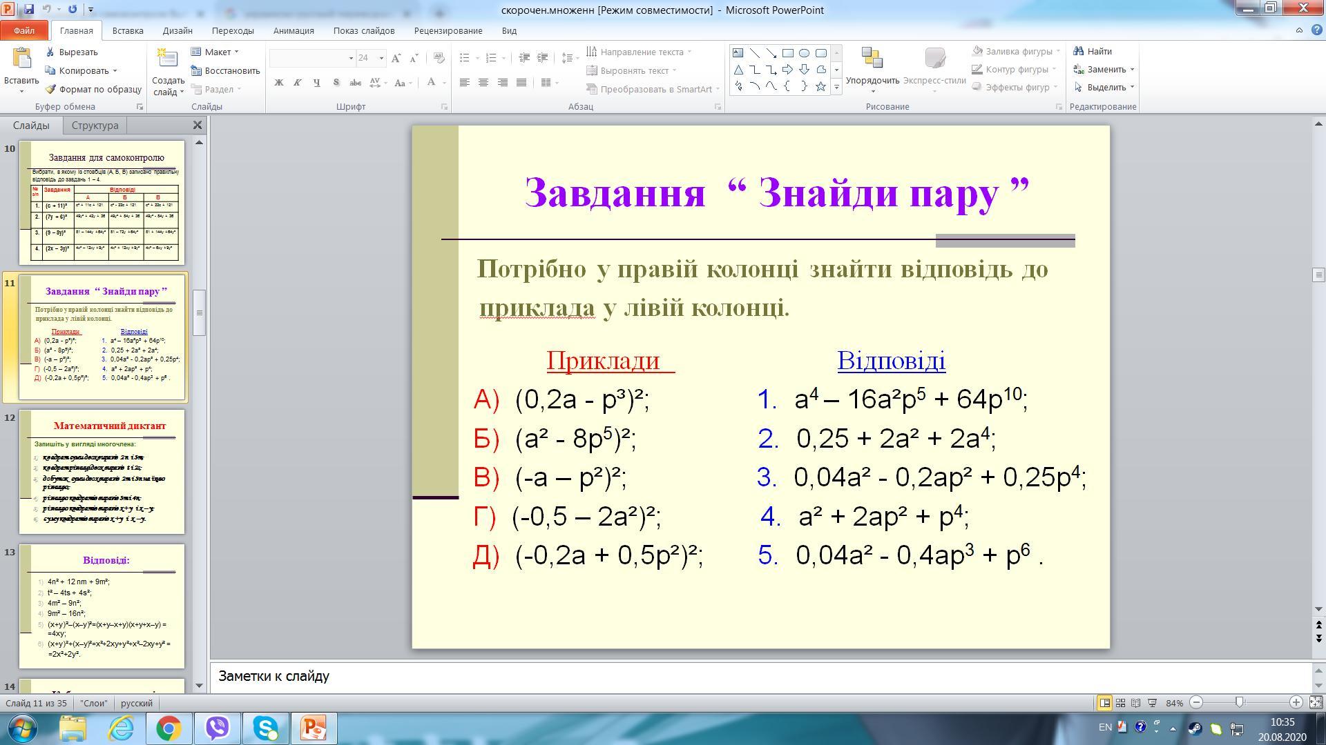 Задача "Найди пару" Нужно в правой колонке найти ответ на примера в левой колонке.Заранее спасибо