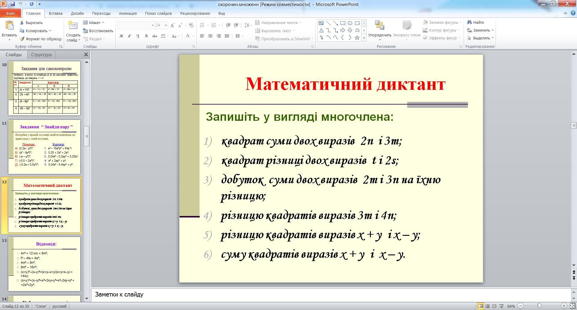 математический диктант Запишите в виде многочлена Заранее спасибо квадрат суммы двух выражений 2n и 3m; квадрат разности двух выражений t и 2s; произведение суммы двух выражений 2m и 3n на их разницу; разность квадратов выражений 3m и 4n; разность квадратов выражений х + у и х -; сумму квадратов выражений х + у и х -.