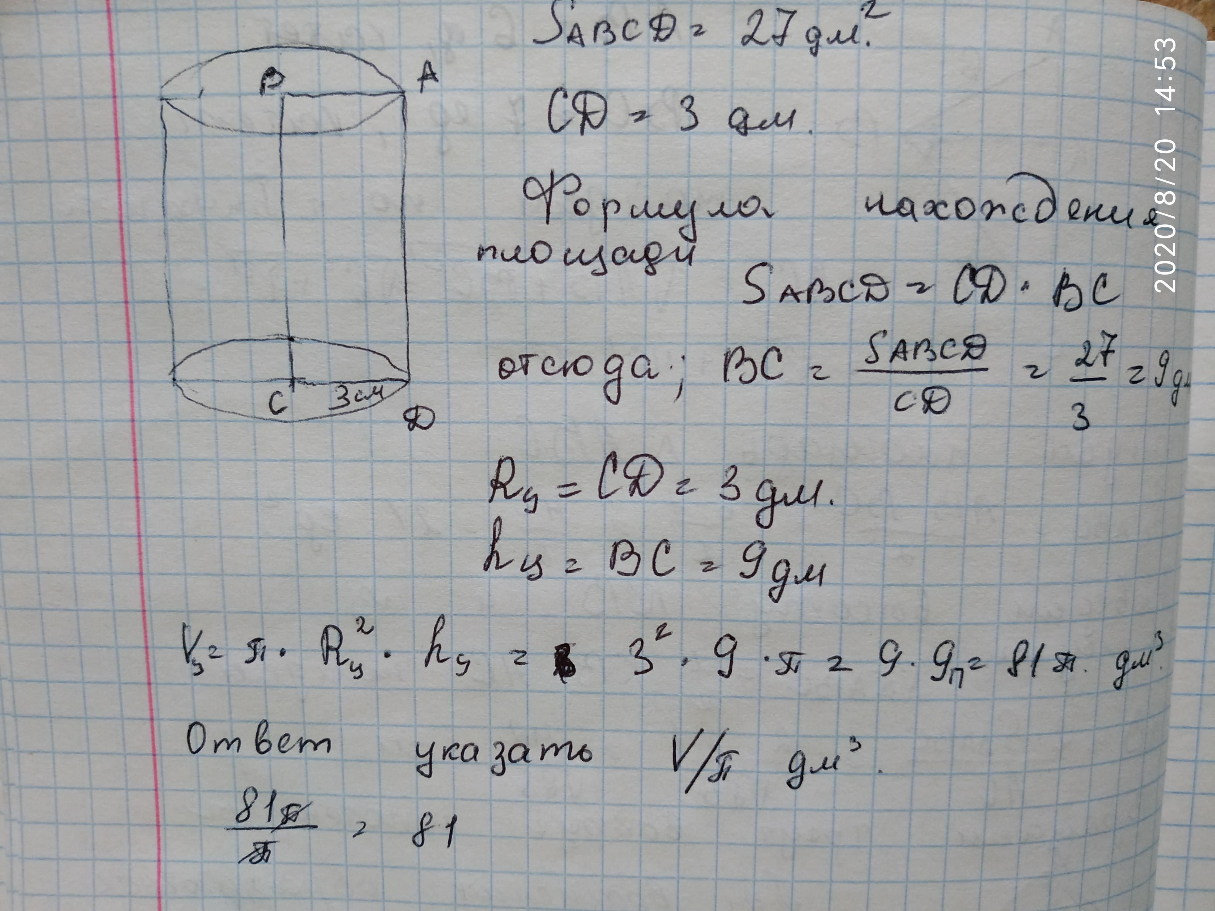 Найдите обьем цилиндра поллученного вращением прямоугольника ABCD вокруг стороны BC ,если длинна стороны DC 3дм а площадь ABCD 27 дм в квадрате ответ указать в v/pi дм кубиче
