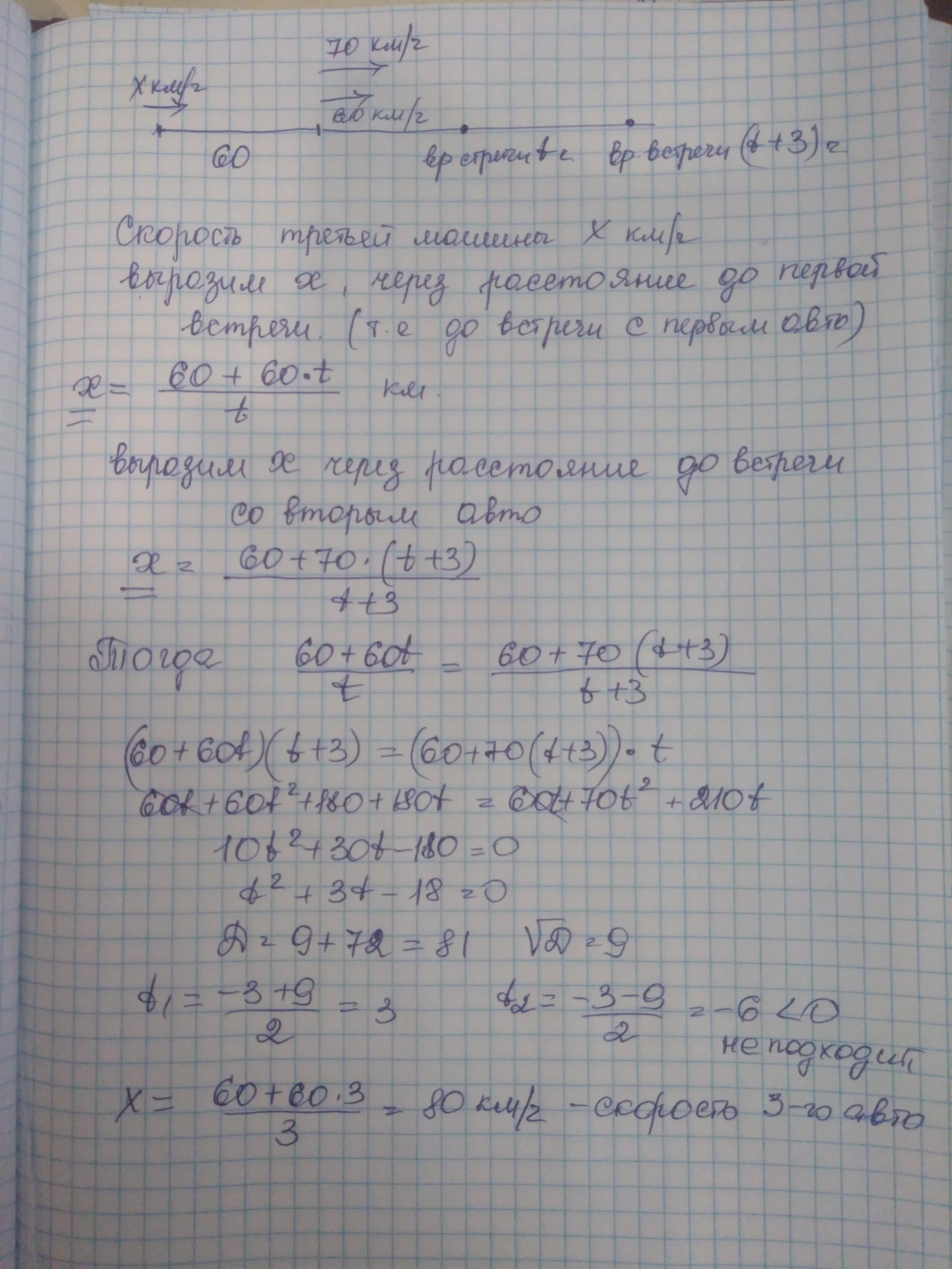 из А в B выхали две автомашины с одинаковыми скоростями 60 км.ч, через час вслед за ними выехала третья автомашина, а вторая в этот момент увеличила скорость на 10 км ч. Третья машина догнала первую, еще через 3 часа вторую машину. Найдите скорость 3-ей автомашины