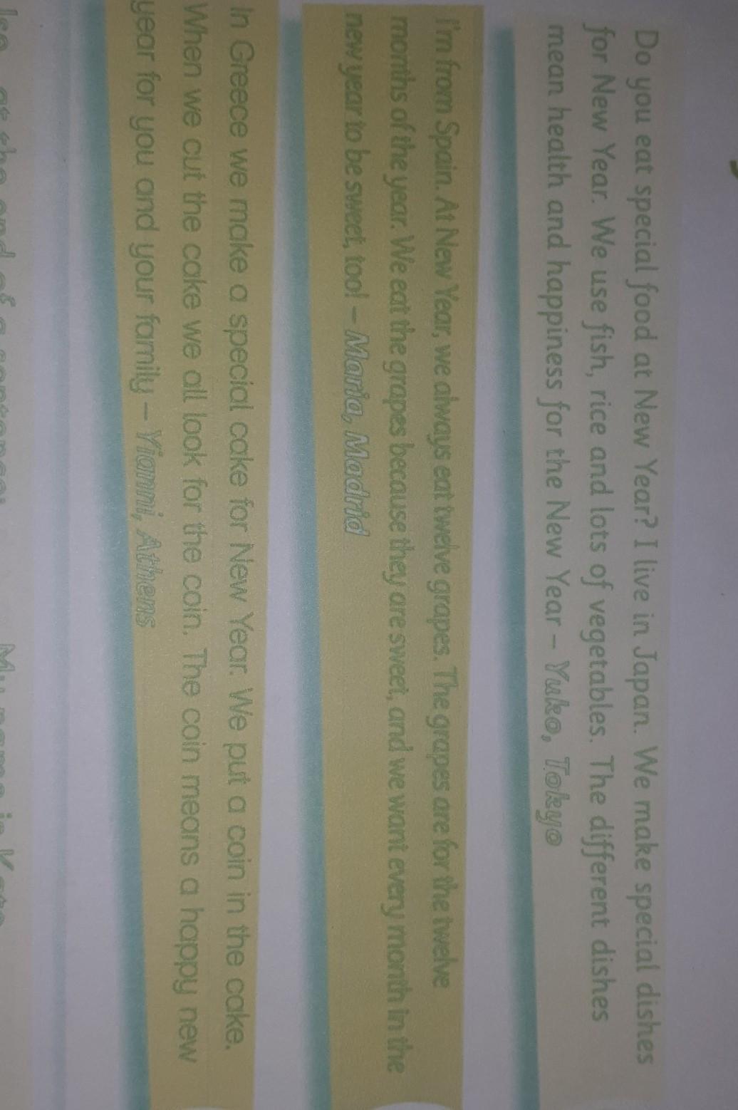 I'm from Uzbekistan. At New Year we usually eat palov, turkey and fruit.