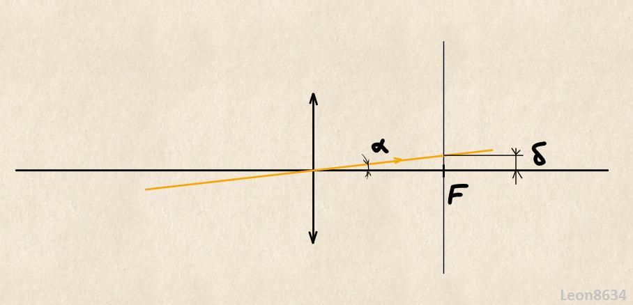 луч света, преломленный в собирающей линзе с оптической силой 1 дптр, пересекает фокальную плоскость на расстоянии 5 мм от главного фокуса. Угол между падающим углом и главной оптической осью