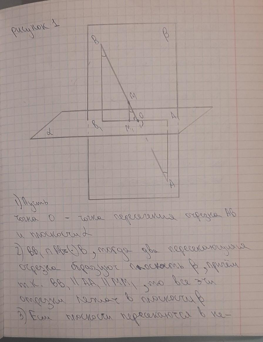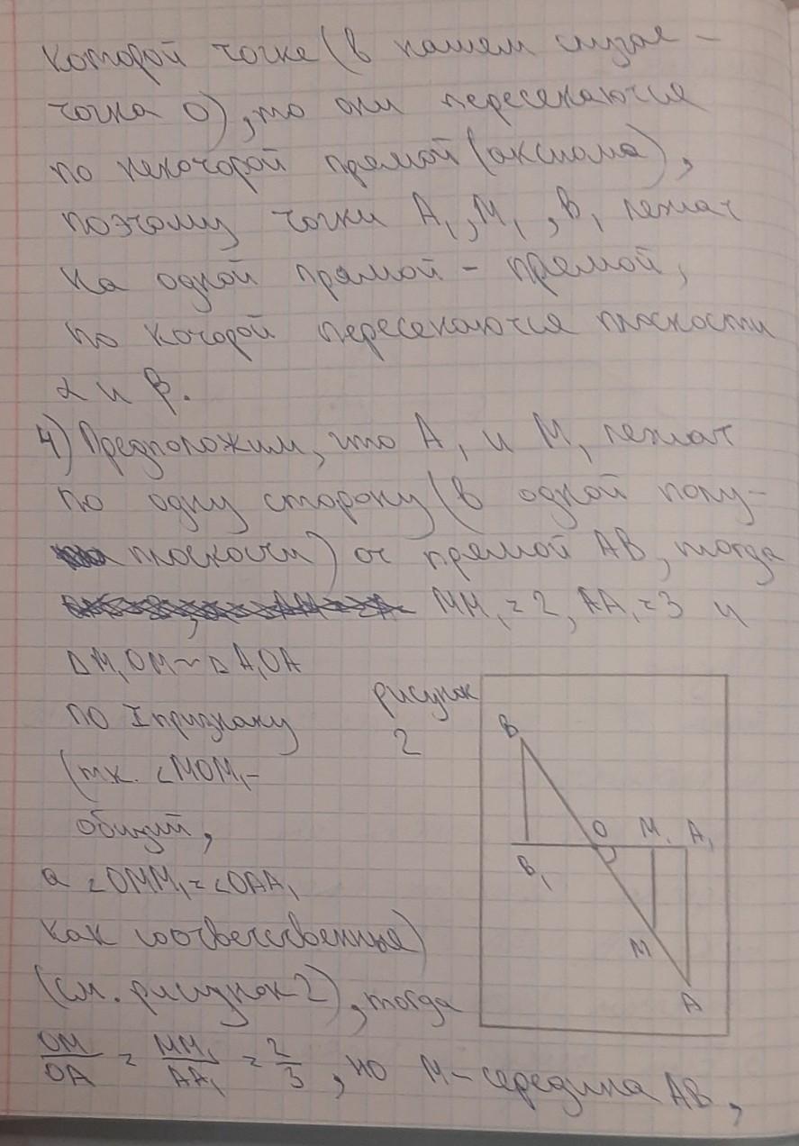 Через концы и середину M отреска AB пересекающего плоскость,проведены парралельные прямые,пересекающие эту плоскость соответственоо в точках A1,B1,M1 .Найдите длину отрезка BB1,если AA1=3дм и ММ1=2дм - все решение на фотографиях