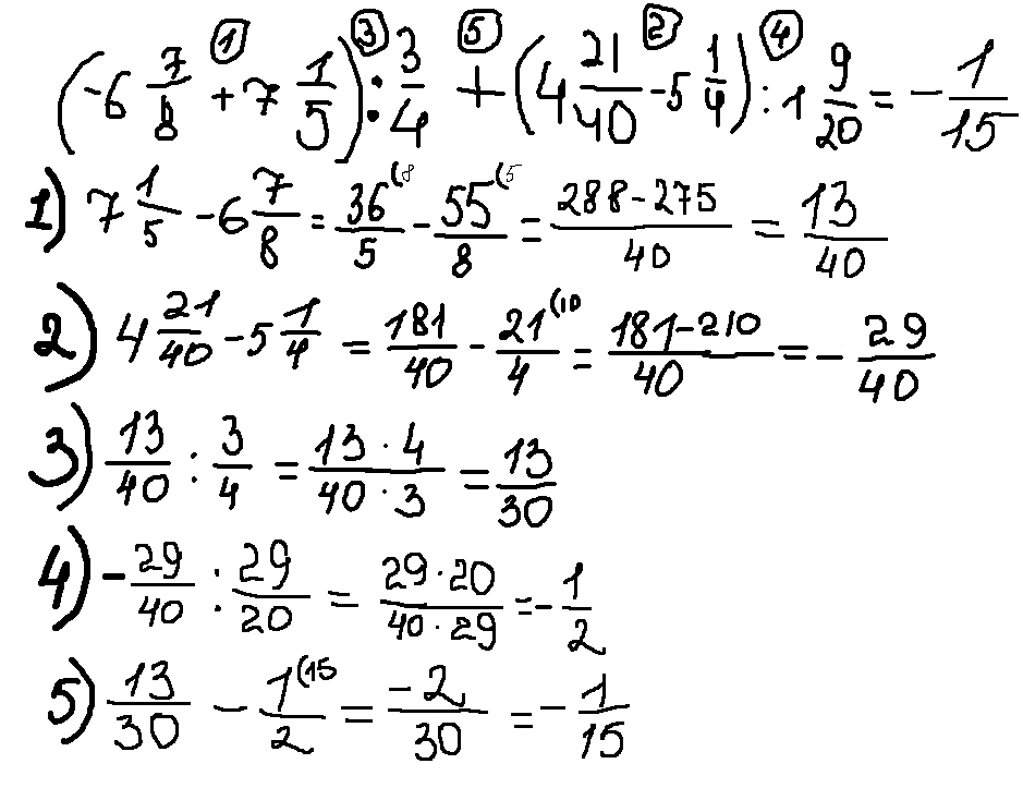 а) ( - 6 (целых) 7/8 + 7 (целых) 1/5) : 3/4 + (4 (целых) 21/40 - 5 (целых) 1/4) : 1 (целых) 9/20
