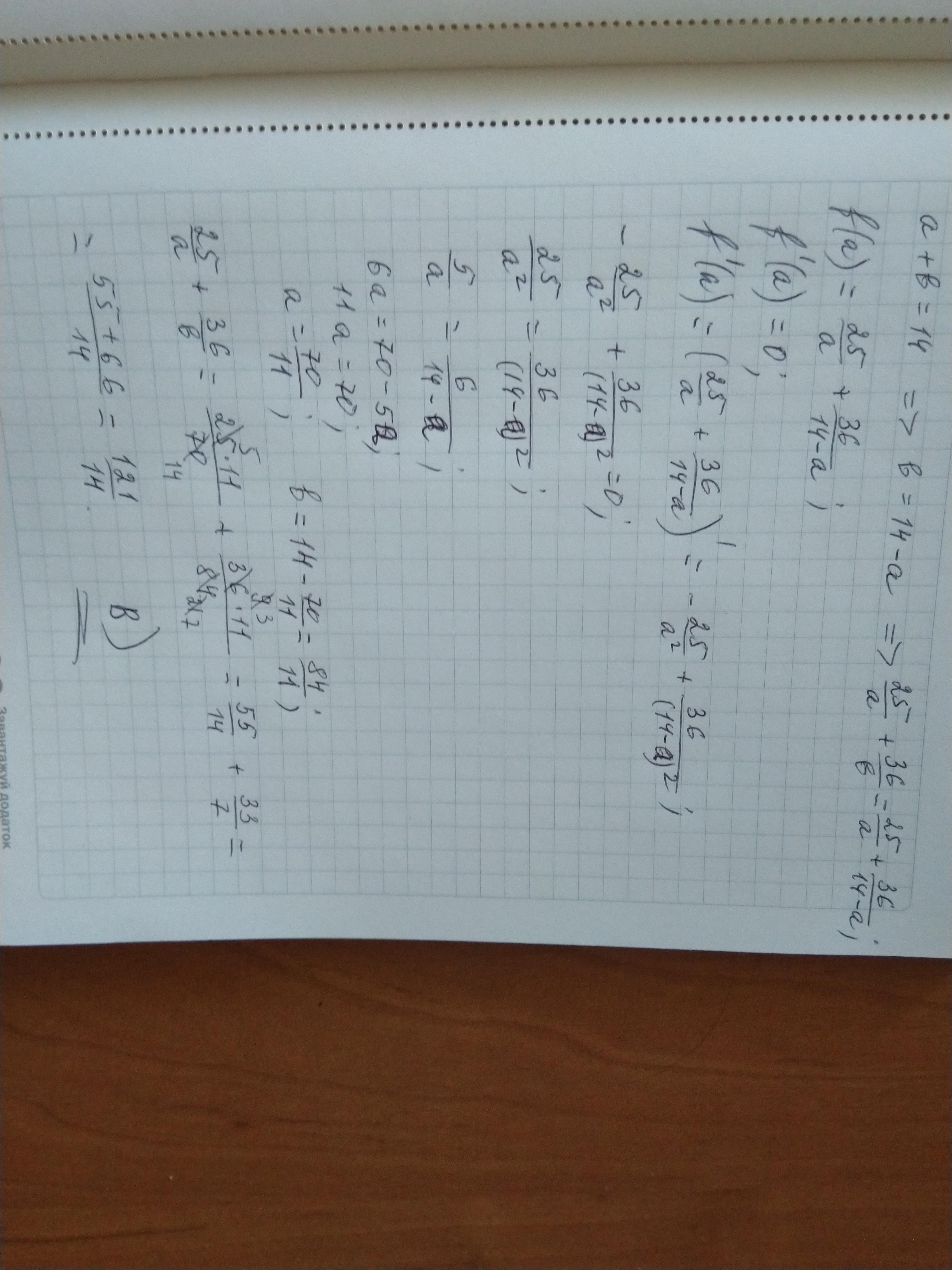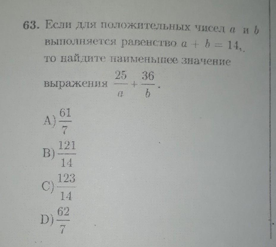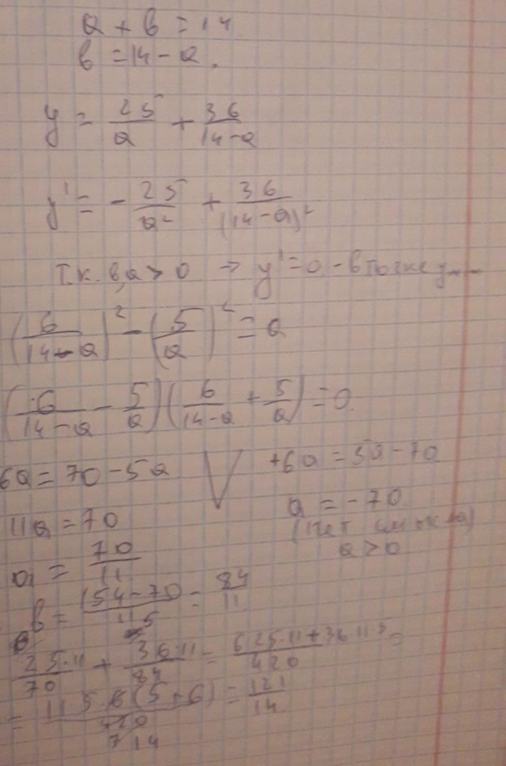 пр63) Если для положительных чисел a и b выполняется равенство a + b=14 , то найдите наименьшее значение выражения 25/a + 36/b .