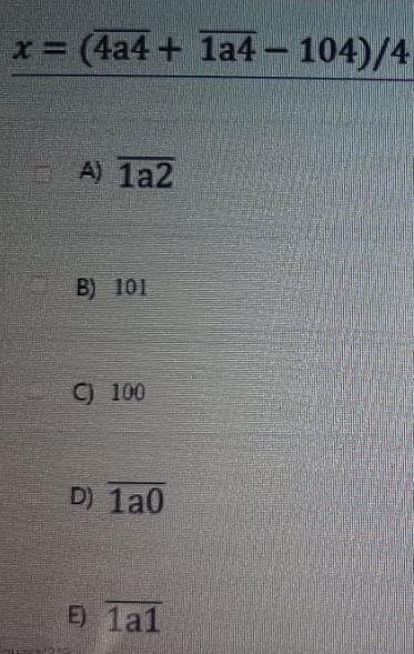 Тут нет правильного ответа. Ответ получается 101 + 5a, его однозначно в виде числа с чертой наверху не получится записать. Единственное, что могу сказать: наиболее подходящий ответ — E)