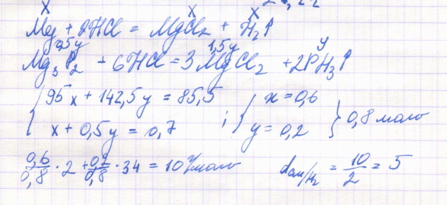 при взаимодействии 0,7 моль смеси магния и фосфида магния с соляной кислотой образовались 85,5 г соли и смесь газов .найдите плотность образованной смеси газов относительно водорода