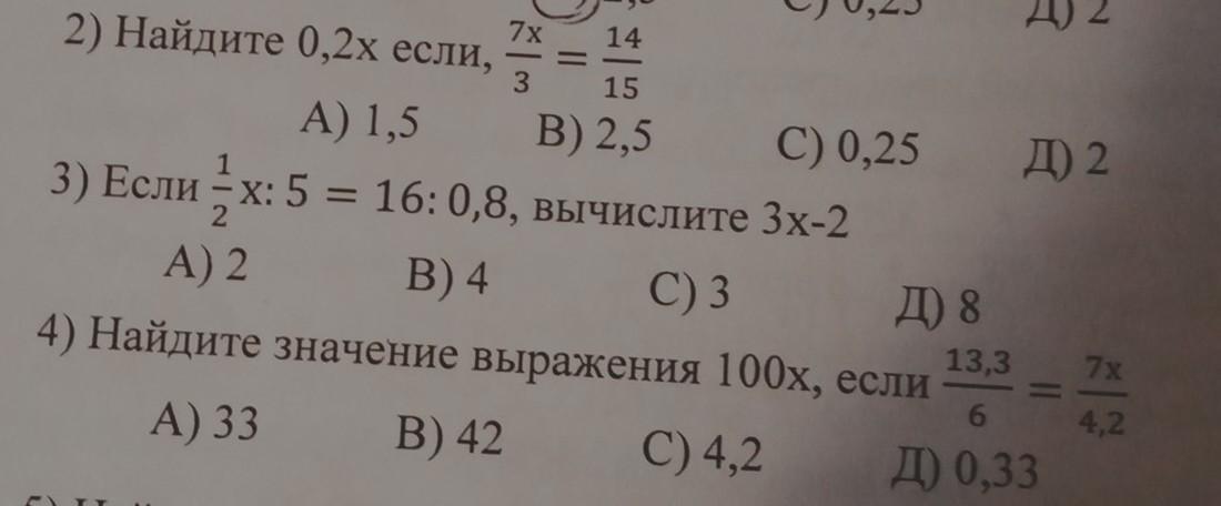 2) 7x*15=3*14; 105x=42, x=42/105=2/5, тогда 0,2x=1/5*2/5=2/25=0,08