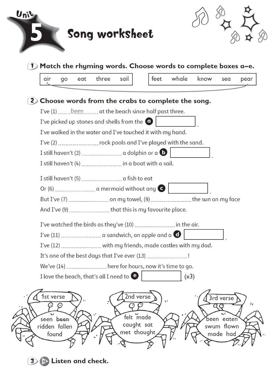 a - sea, 2 - found, 3 - seen, b - whale, 4 - ridden, 5 - caught, 6 - met, c - feet, 7 - sat, 8 - felt, 9 - thought, 10 - flown, 11 - eaten, d - pear, 12 - swum, 13 - had, 14 - been, e - know.