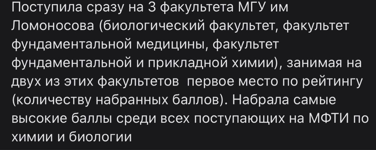 Кроме того, я показала самые высокие баллы по химии и биологии среди всех поступающих в МФТИ.
