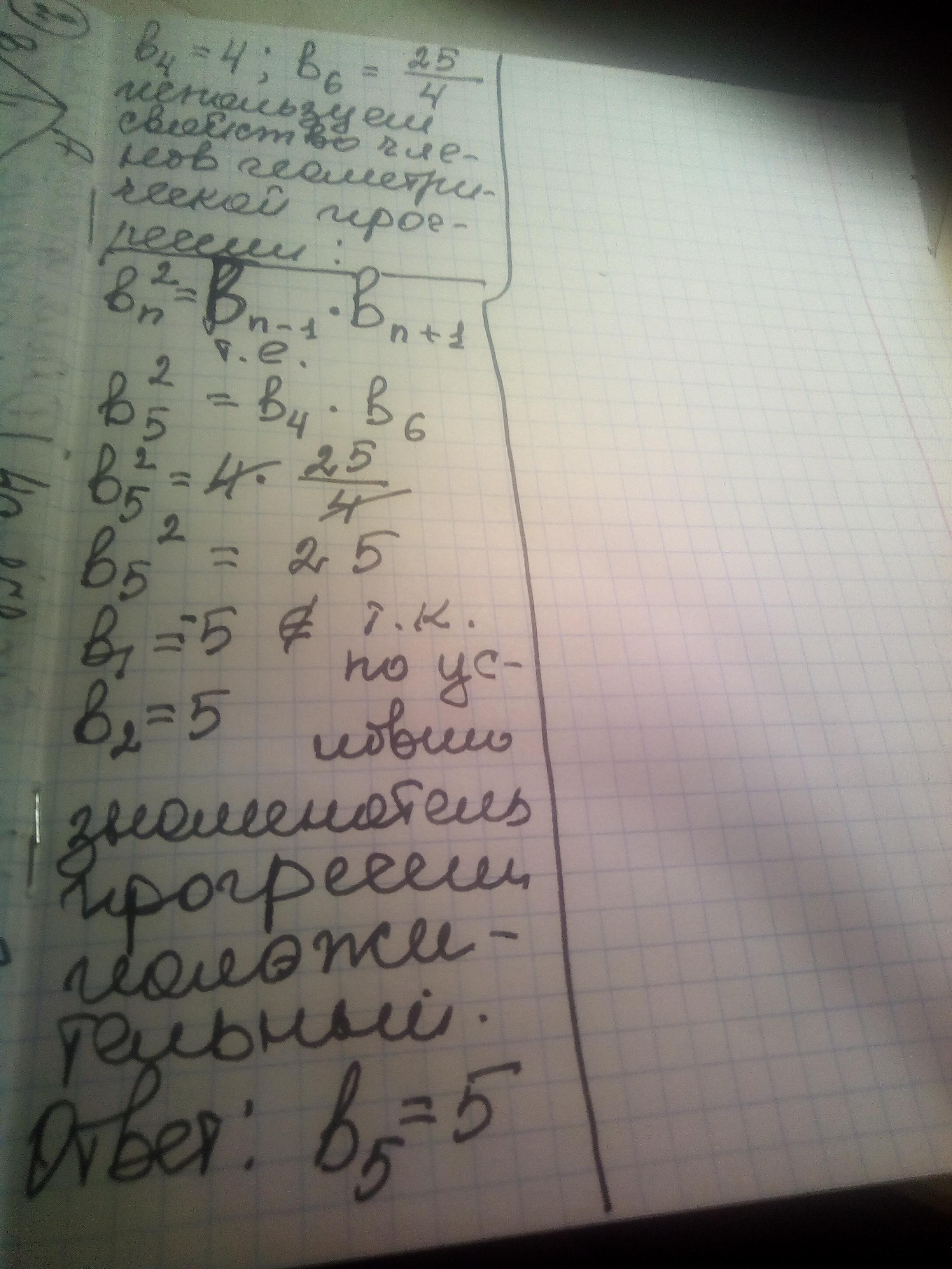 В геометрической прогрессии b4=4, b6=25/4. Найти b5, если известно, что знаменатель прогрессии положителен
