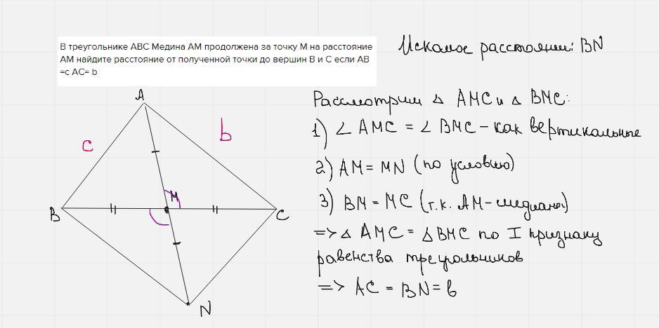 В треугольнике ABC Медина АМ продолжена за точку М на расстояние АМ найдите расстояние от полученной точки до вершин В и С если АВ =с АС= b