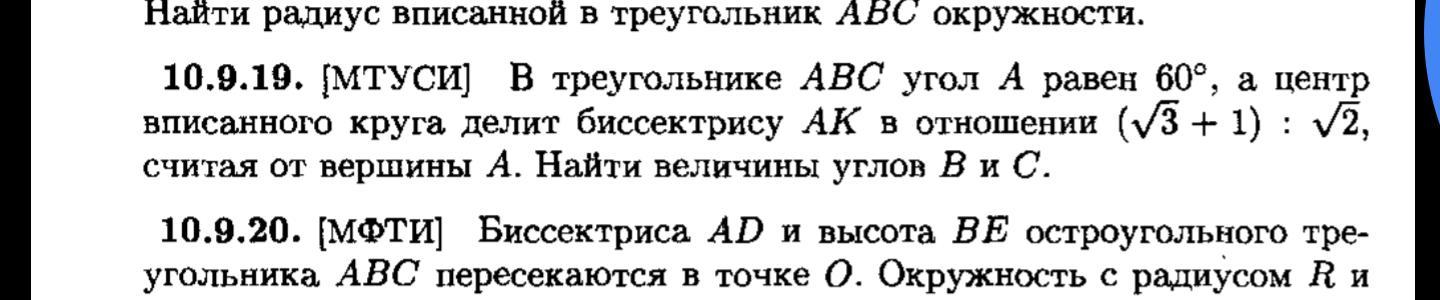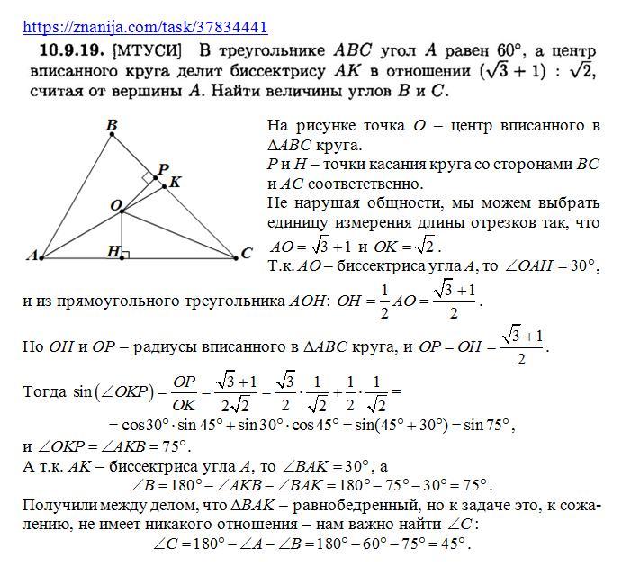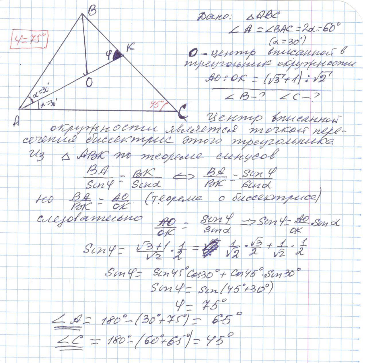 В треугольник ABC угол A равен 60° ,а центр вписанного круга делит биссектрису AK в отношении (√3+1) :(√2,считая от вершины A. Найти величины B и C.