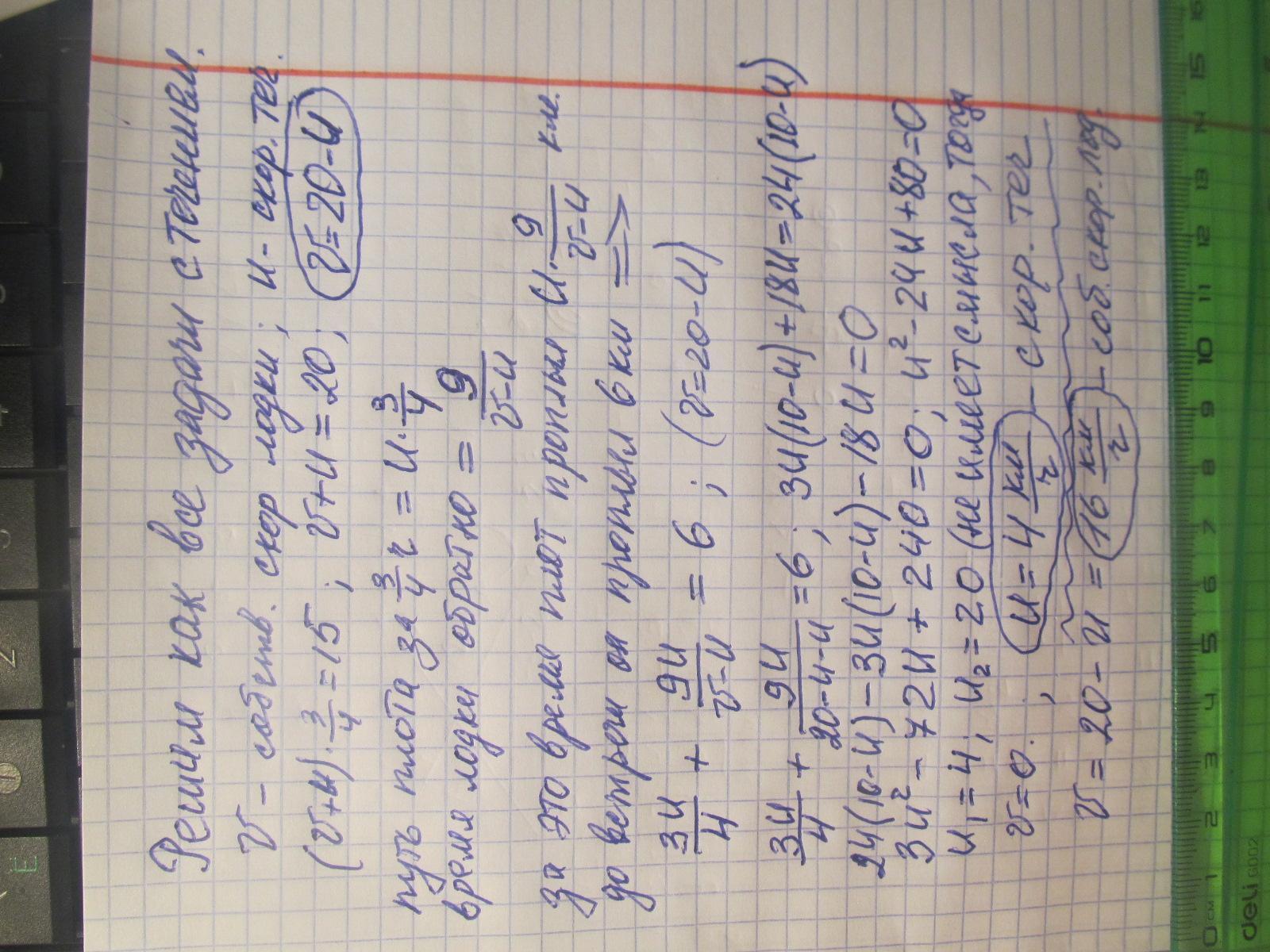 Мимо пристани проходит плот. В этот момент от пристани в поселок, находящийся на расстоянии 15 км от нее, вниз по реке отправляется моторная лодка. Она дошла до поселка за время t = 3/4 ч и, повернув обратно, встретила плот на расстоянии 9 км от поселка. Каковы скорость течения реки u относительно берега и скорость лодки v относительно воды? Решал сам и у меня получилось квадратное уравнение 1 из корней которого подходит ответам и равен 4(скорость течения), а второй равняется 20 и не входит в ответ. Как быть? Другие решения с интернета не скидывать, они неверные.
