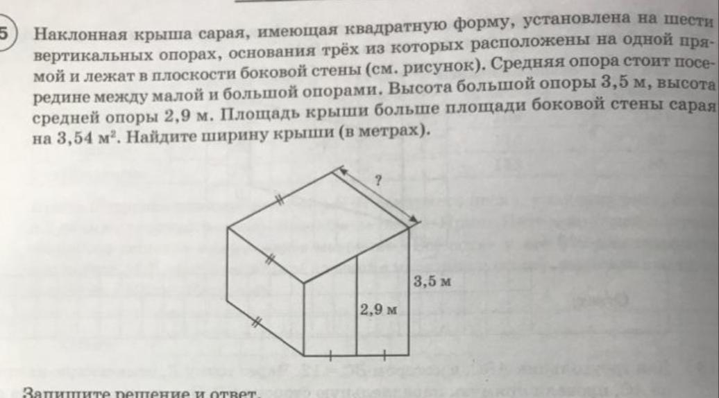 Наклонная крыша сарая, имеющая квадратную форму, установлена на шести вертикальных опорах, основания трёх из которых расположены на одной прямой и лежат в плоскости боковой стены (см. рисунок). Средняя опора стоит по середине между малой и большой опорами. Высота большой опоры 3,5 метра, высота средней опоры 2,9м. Площадь крыши больше площади боковой стены сарая на 3,54м². Найдите ширину крыши.