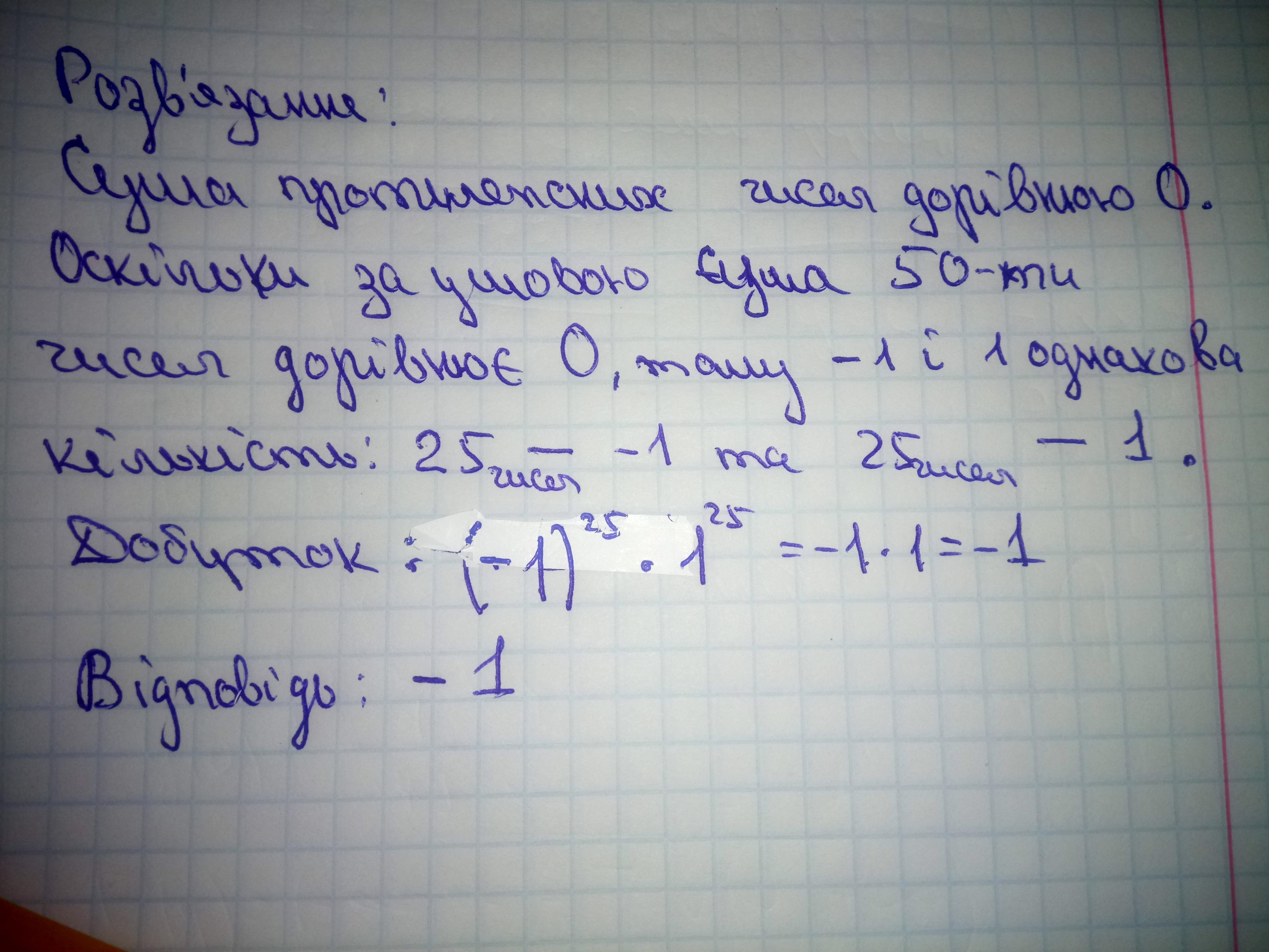 Сума п’ятдесяти чисел, кожне з яких дорівнює або 1, або – 1, дорівнює нулю. У відповідь запишіть їх добуток.