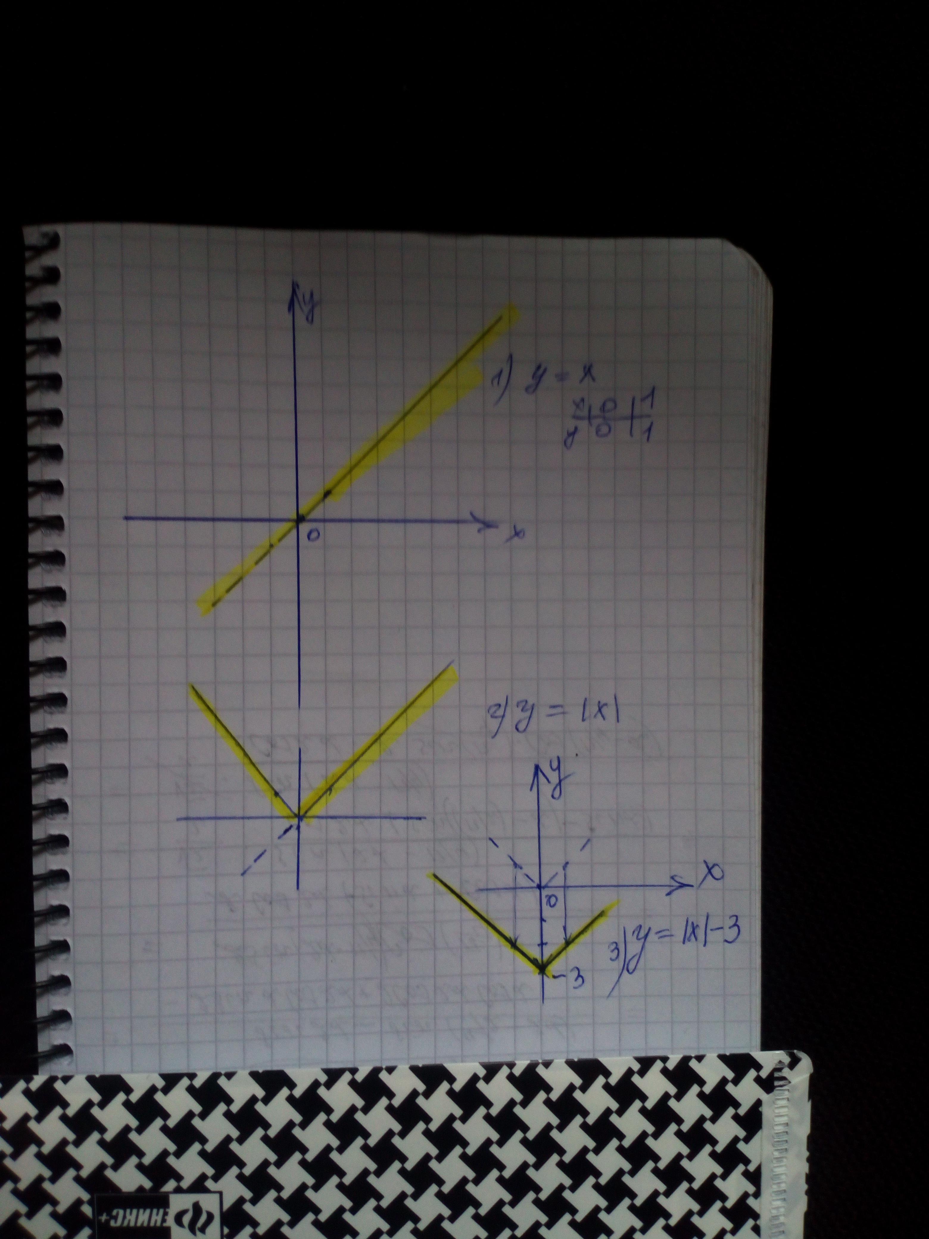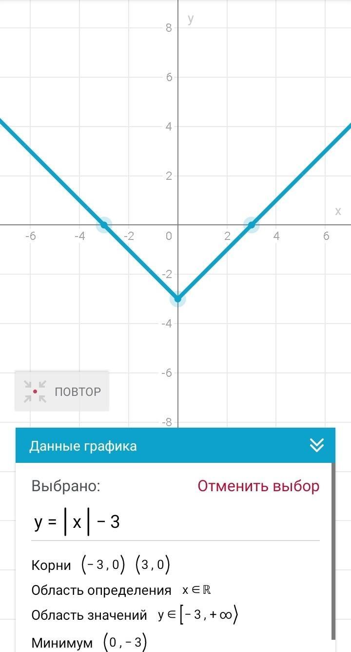 Пошаговое объяснение:строим график у=х, затем отображаем ту часть, которая ниже оси ох, симметрично оси ох, и, наконец полученный график опускаем на 3 ед. вниз.