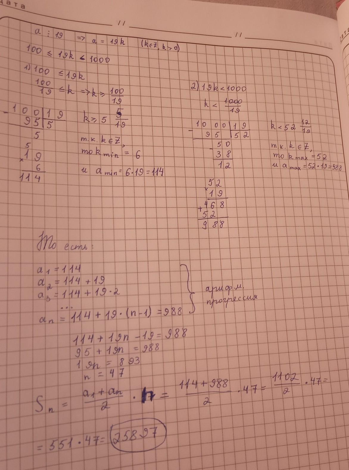 Найдите сумму всех трехзначных натуральных чисел кратных 19