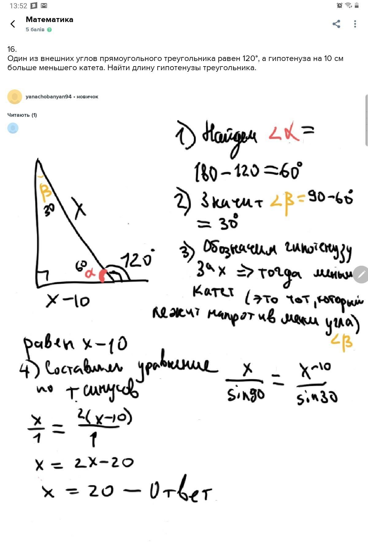 Один из внешних углов прямоугольного треугольника равен 120°, а гипотенуза на 10 см