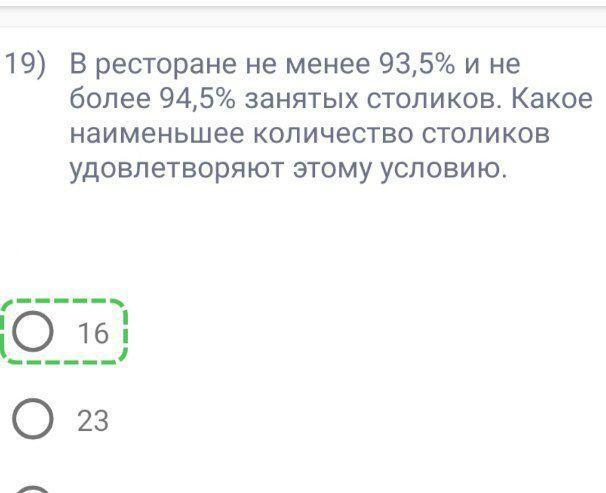 Поскольку свободных столиков согласно условия задачи не более 100%-93,5%=6,5% от общего числа столиков, то всего в ресторане не менее 1: 0,065 = 15 1/40 столиков, то есть не менее 16 столиков.