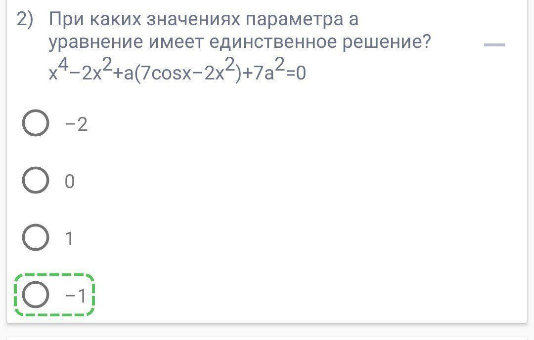 Заметим, что если x является решением уравнения, то и -x также является решением уравнения (действительно, возведение в квадрат, в четвёртую степень и взятие косинуса "убивает" минус). Значит, необходимое условие единственности решения: x = -x ⇒ x = 0 (условие не достаточное, так как помимо 0 могут быть и другие решения, поэтому каждое значение параметра необходимо будет проверить).