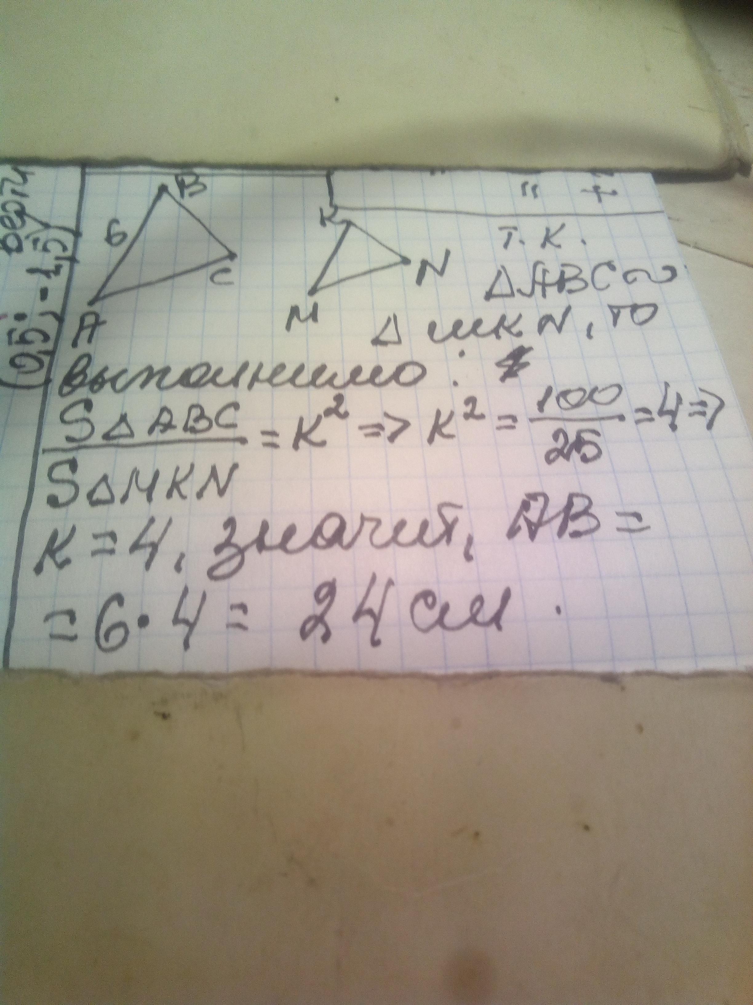 Треугольники ABC и MKN подобны. Площадь треугольника ABC равна 100, а площадь треугольника