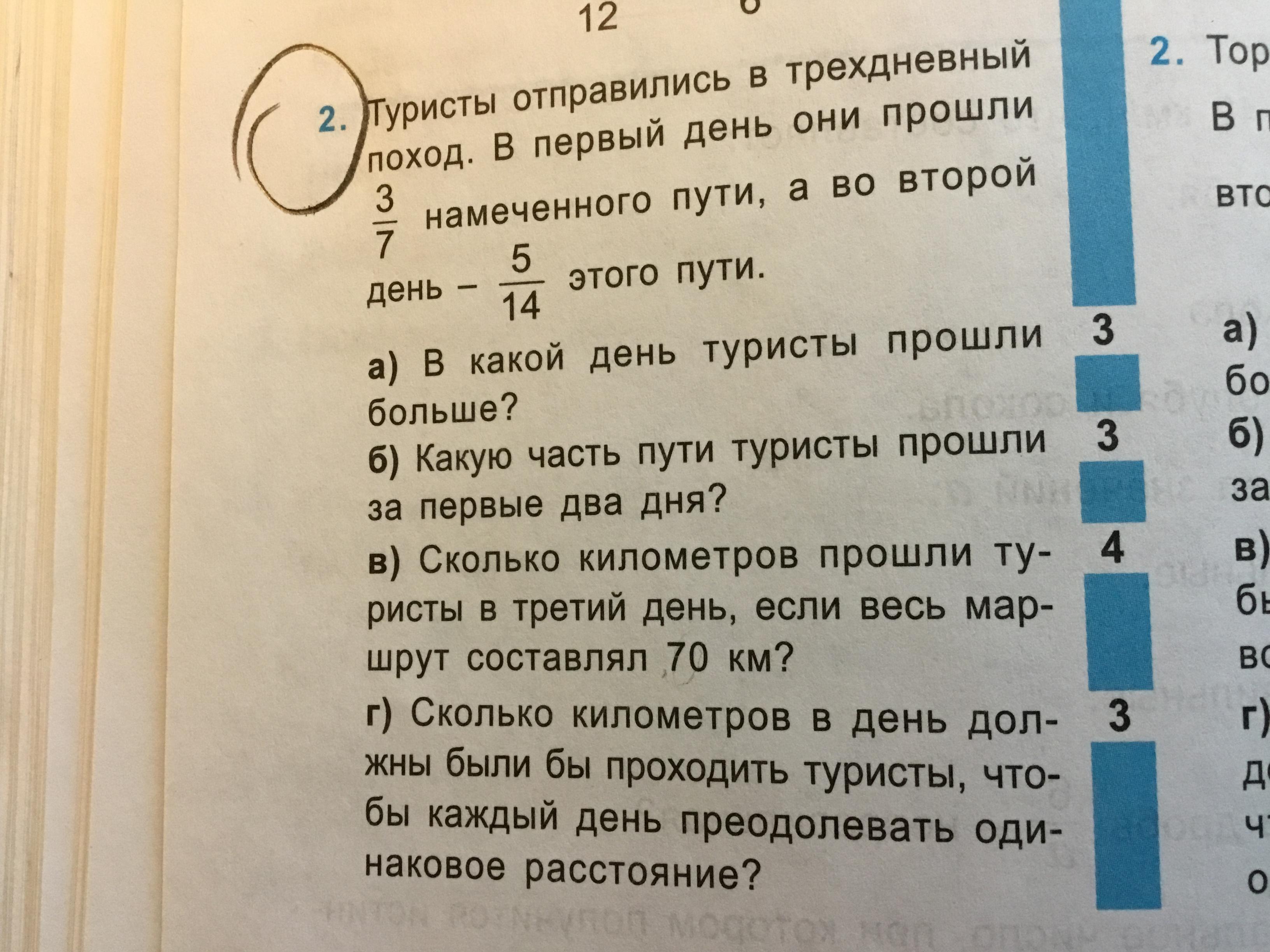 г)Сколько км в день должны были бы проходить туристы, чтобы каждый день преодолевать одинаковое расстояние?