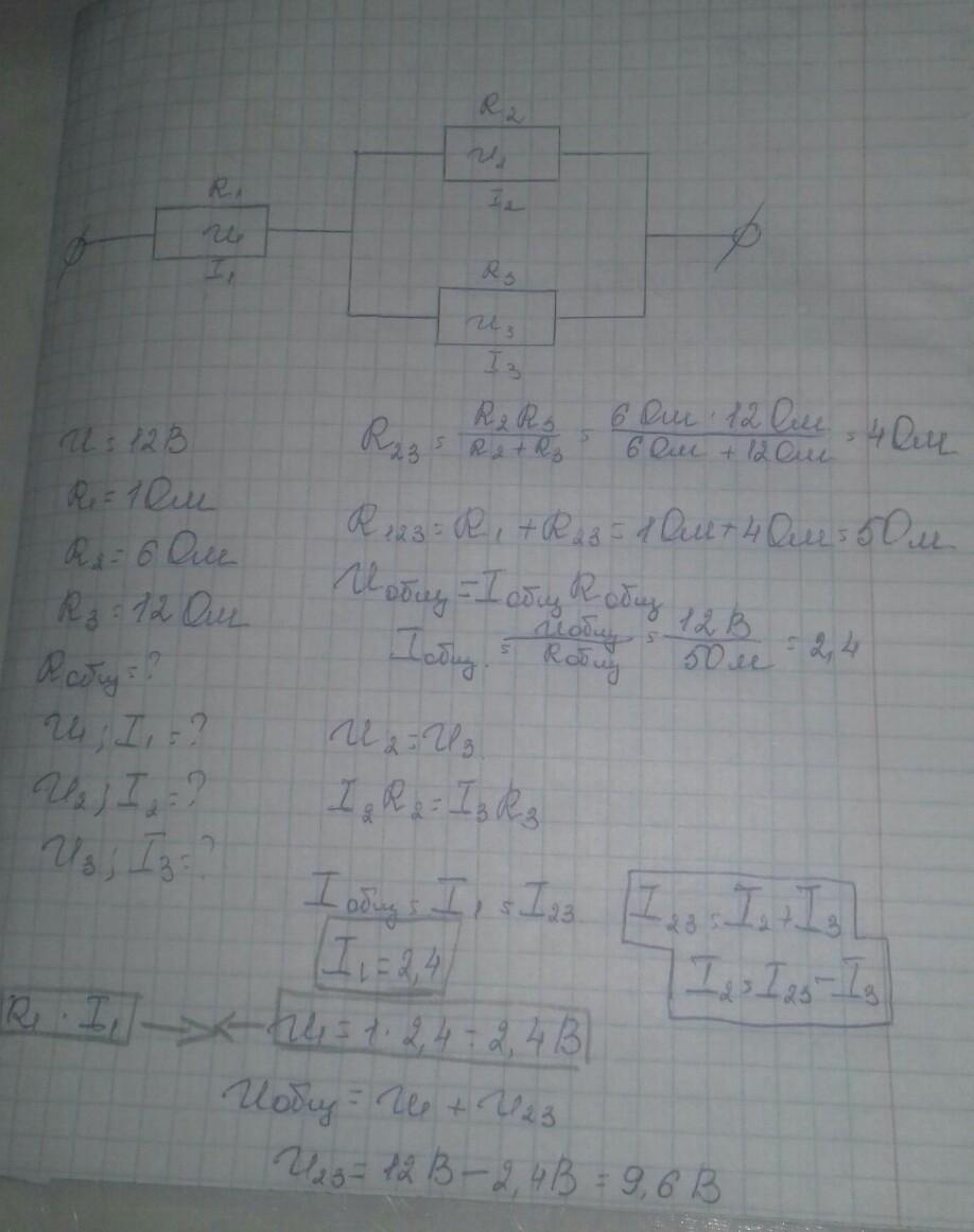 Відомо: U=12B; R1=1 Ом; R2=6 Ом; R3=12 Ом. Знайти: R,U1, I1, U2, I2, U3, I3 - ?