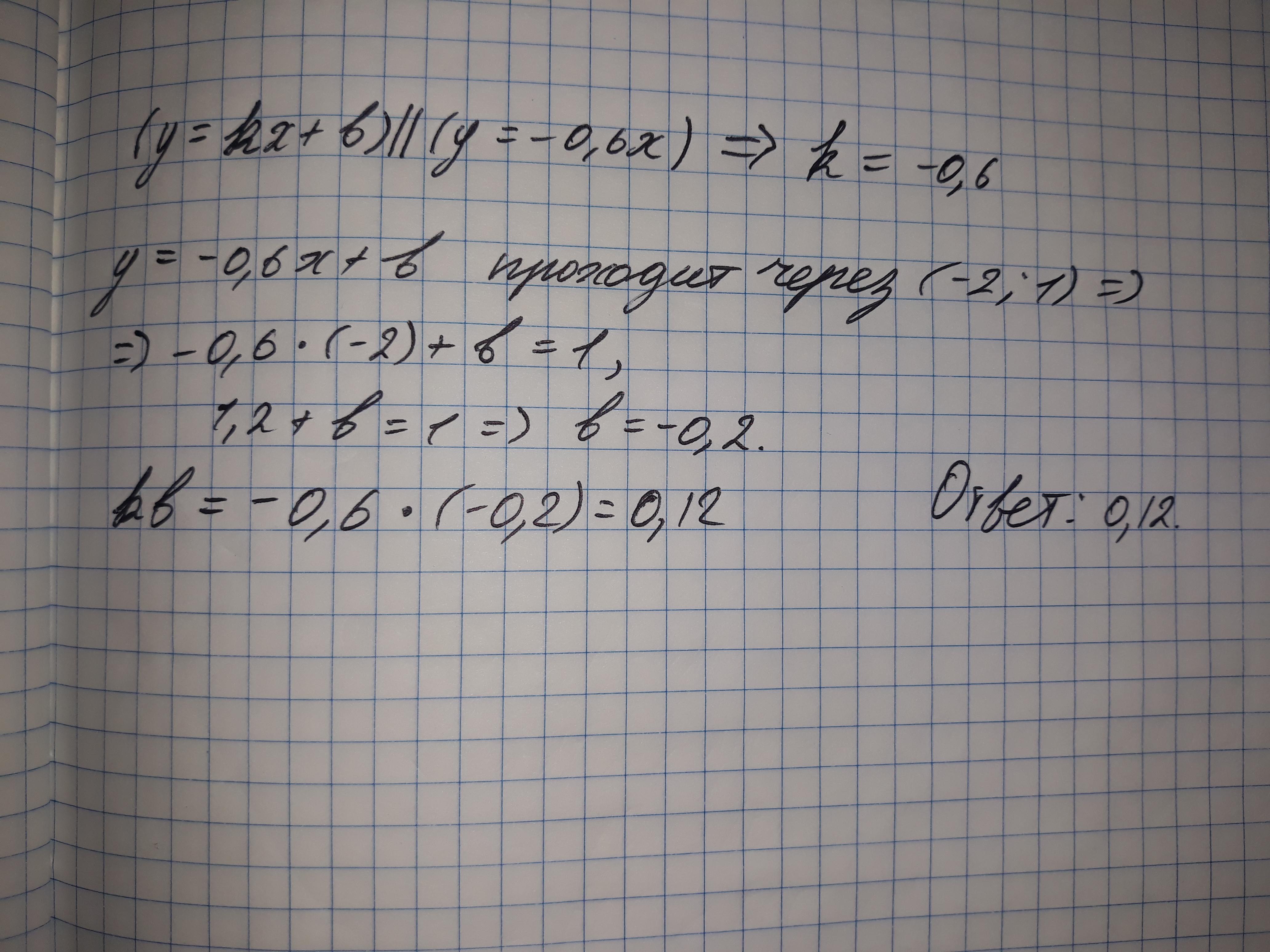 Прямая, Y = kx + b параллельна прямой = -0,6x и проходит через точку (-2;1) Найдите произведение kb. Срочно!