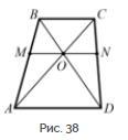 В трапеции отрезок `MN` параллелен основаниям (рис. 38), `MN=4`, сумма оснований равна `9`. Найдите основания