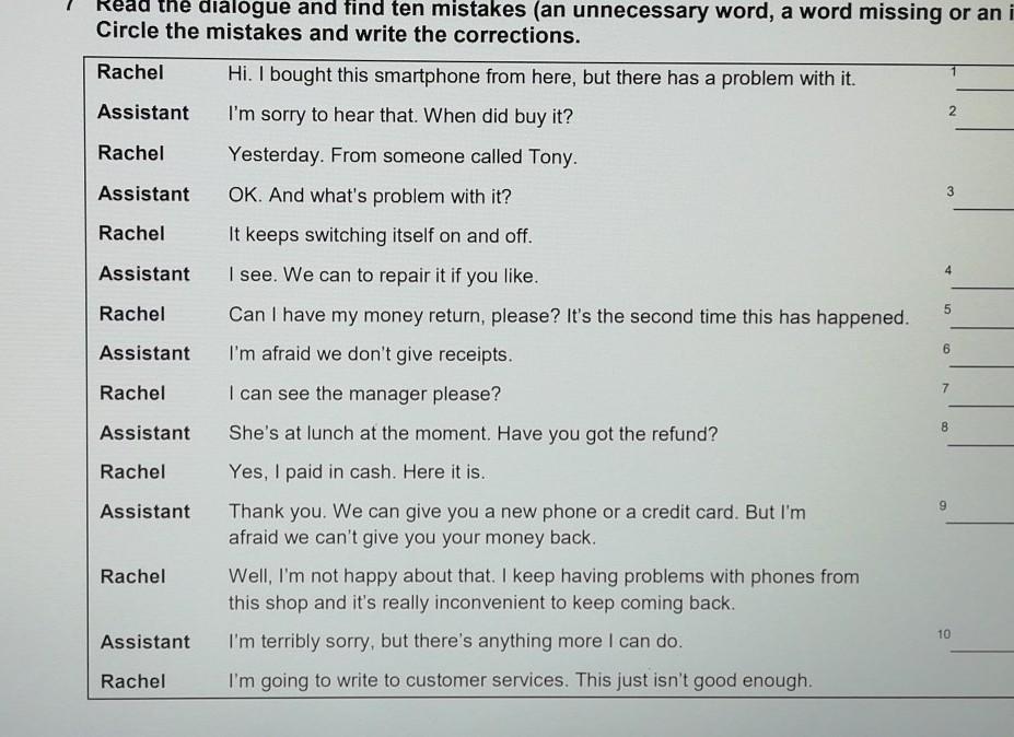 Read the dialogue and find ten mistakes (an unnecessary word, a word missing or an incorrect word).