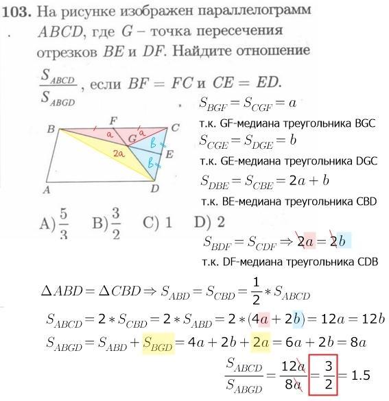 осталось провести отрезок CG и рассмотреть получившиеся треугольники... оказывается, у всех получившихся четырех треугольников площади одинаковые...