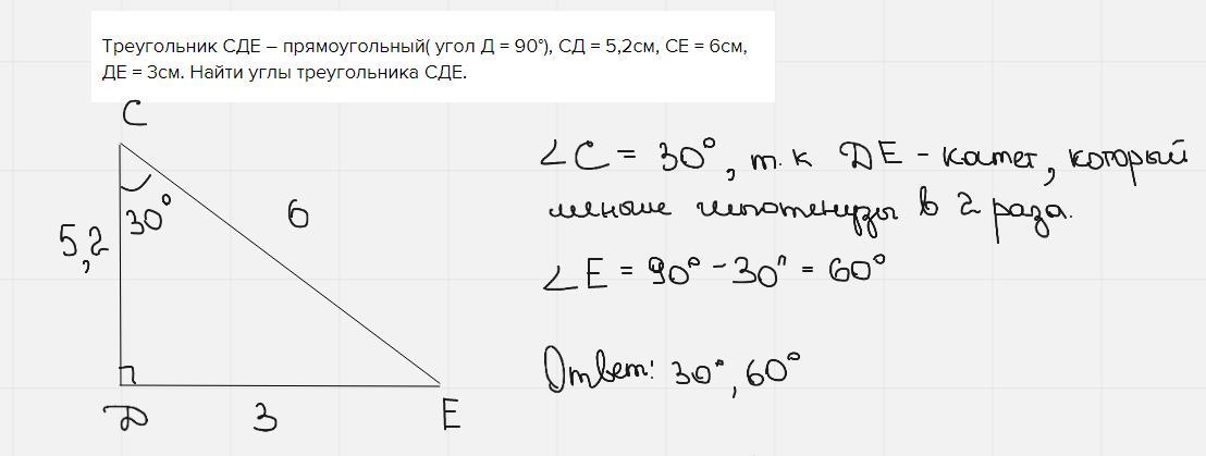 Треугольник СДЕ – прямоугольный( угол Д = 90°), СД = 5,2см, СЕ = 6см, ДЕ = 3см. Найти углы треугольника СДЕ.