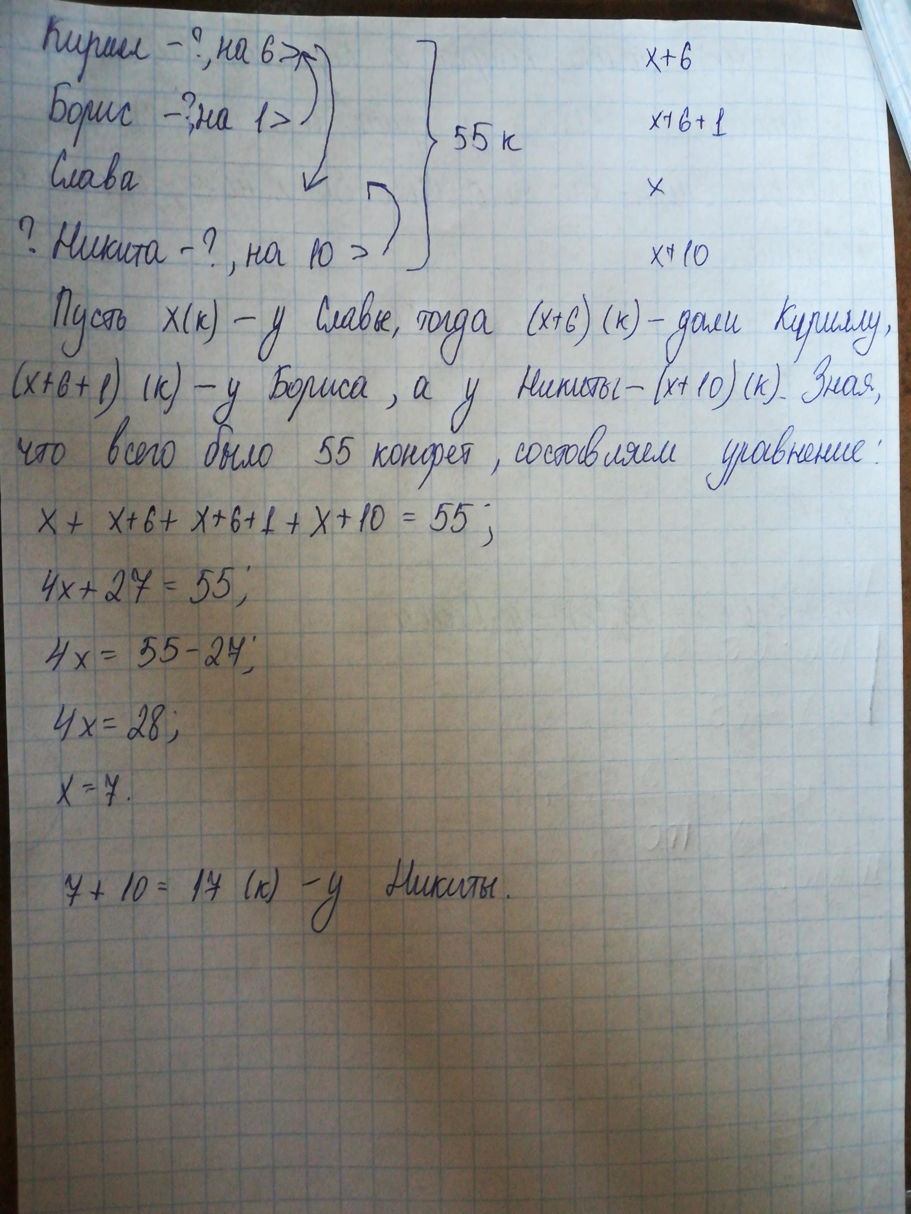 Никите - на десять больше, чем Славе. Сколько конфет достанется Никите?
