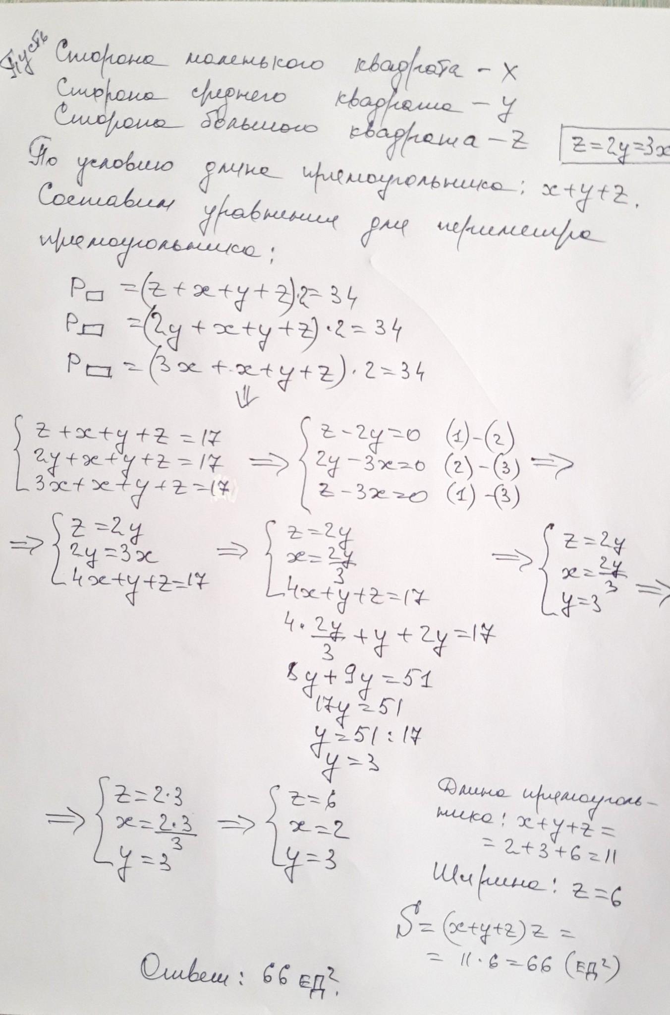 Найдите площадь прямоугольника (см. рис.), составленного из квадратов, если его периметр равен 34 см. Ответ запишите в кв.см.