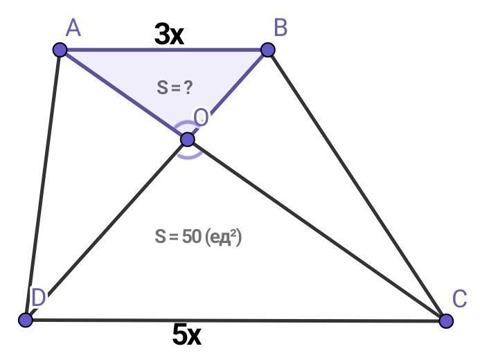 в трапеции abcd,(ab||cd) отношение оснований равно 3:5 и диагонали пересекаются в точке o. найдите площадь треугольника aob, если площадь треугольника cod=50