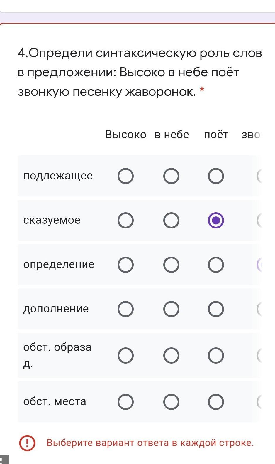 Высоко(обстоятельство образа действия) в небе( обстоятельство места) поёт(сказуемое) звонкую(определение) песенку(дополнение) жаворонок(подлежащее).